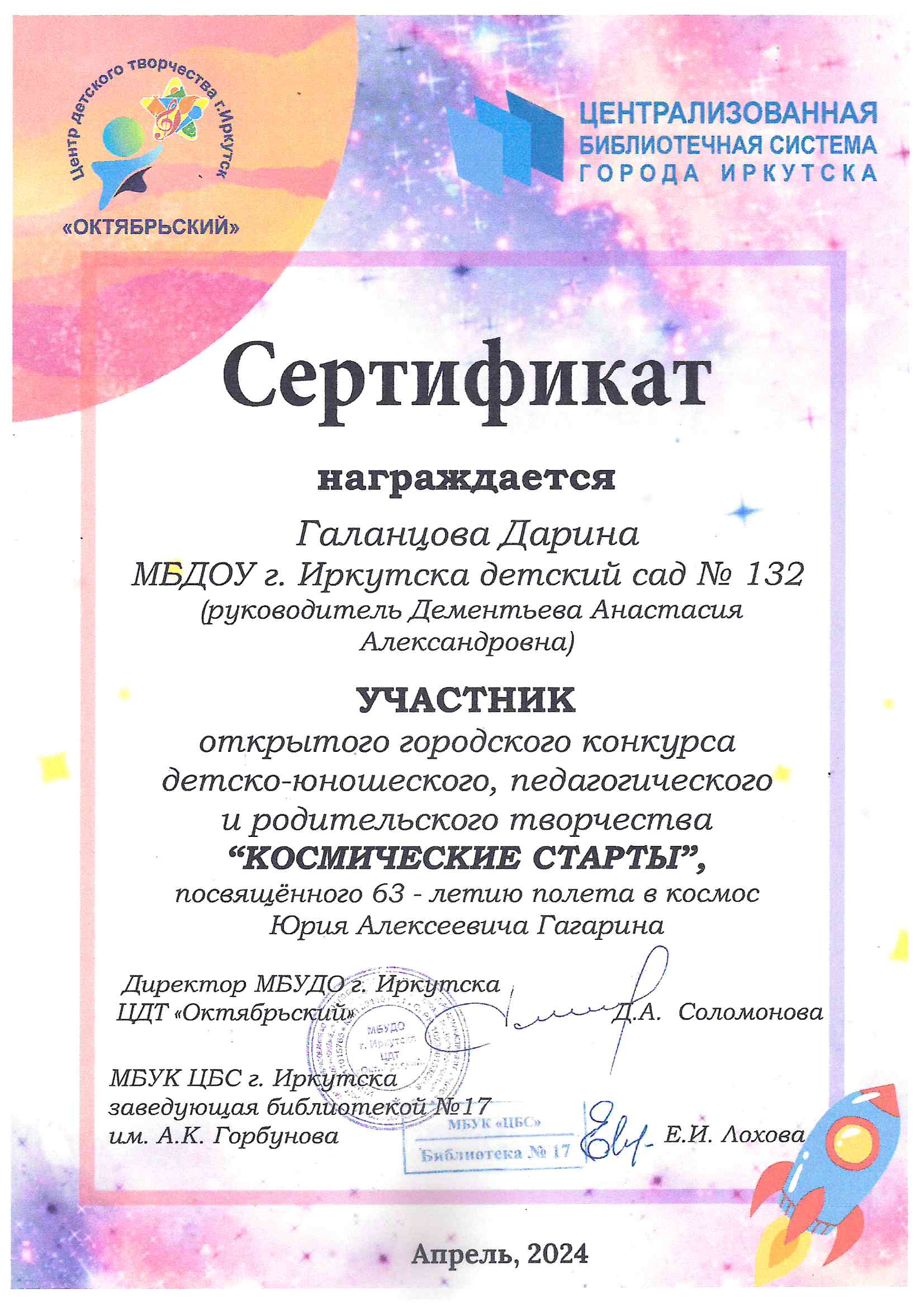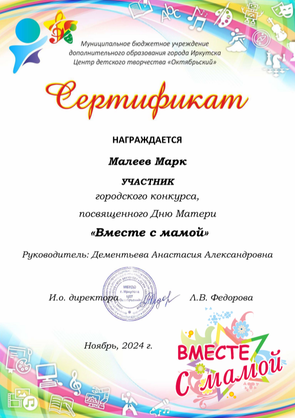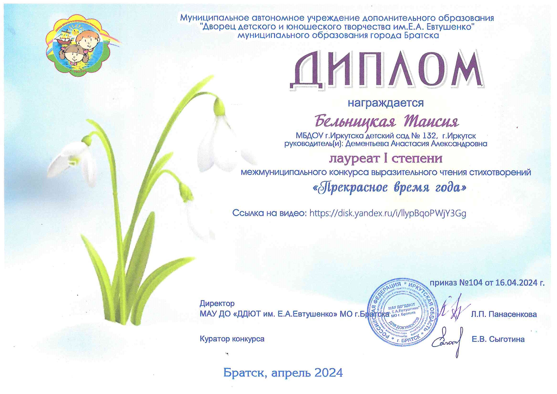 | 2024 | МАУ ДО «Дворец детского и юношеского творчества им. Е.А. Евтушенко» МО г.Братска | Межмуниципальный конкурс выразительного чтения стихотворений «Прекрасное время года» |