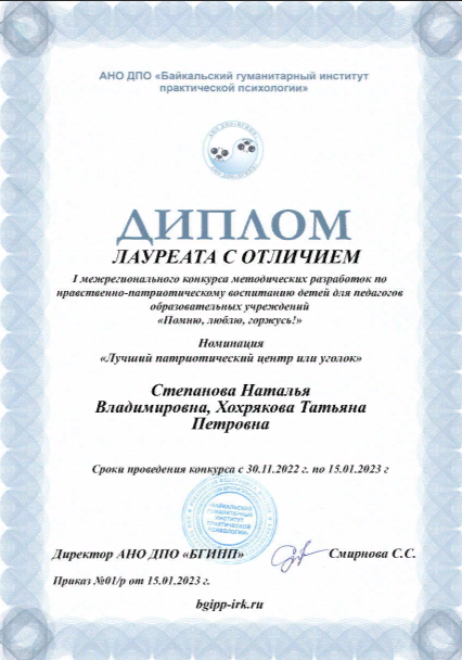 I межрегиональный конкурс методических разработок пол нравственно-патриотическому воспитанию детей для педагогов образовательных учреждений «Помню, люблю, горжусь!», номинация «Лучший патриотический центр или уголок» |