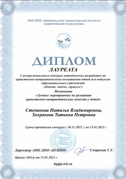 I межрегиональный конкурс методических разработок пол нравственно-патриотическому воспитанию детей для педагогов образовательных учреждений «Помню, люблю, горжусь!», номинация «Лучшее мероприятие по развитию нравственно-патриотических качеств у детей» |