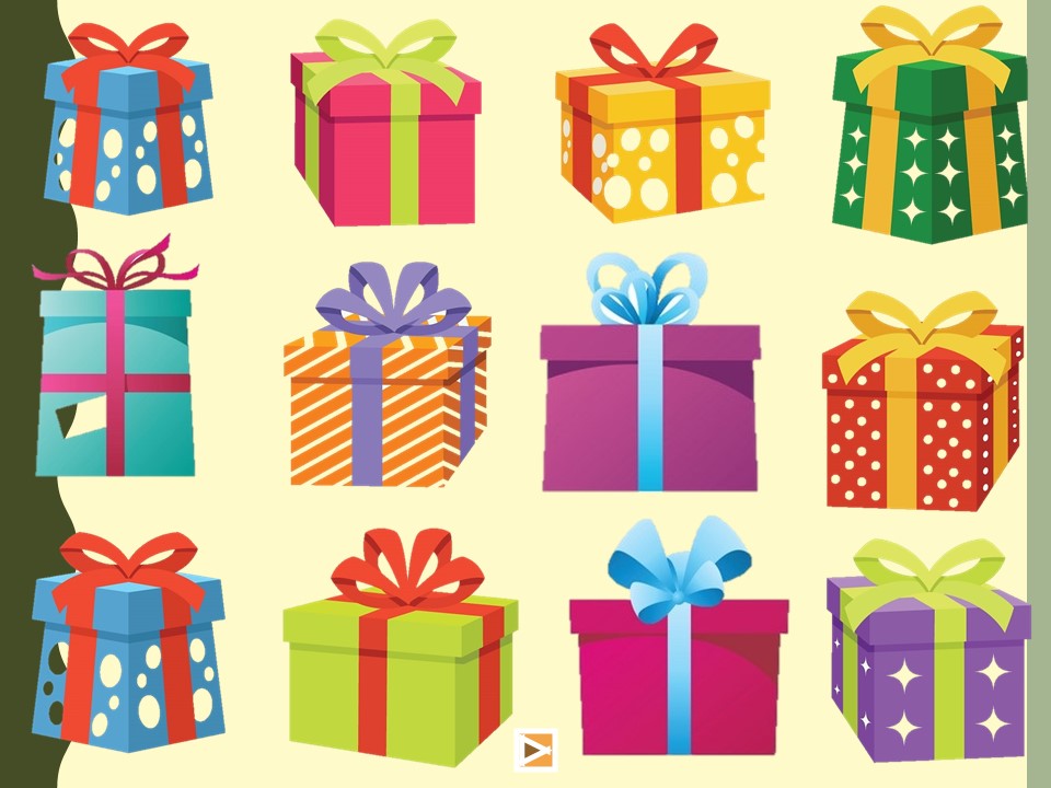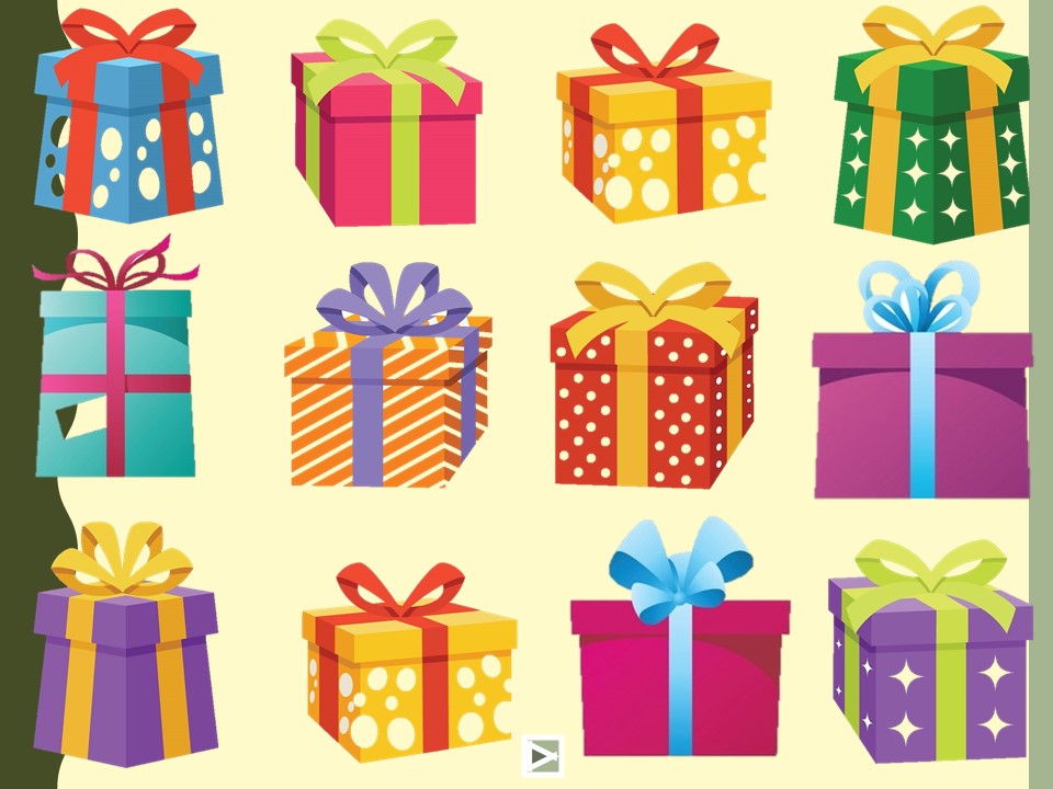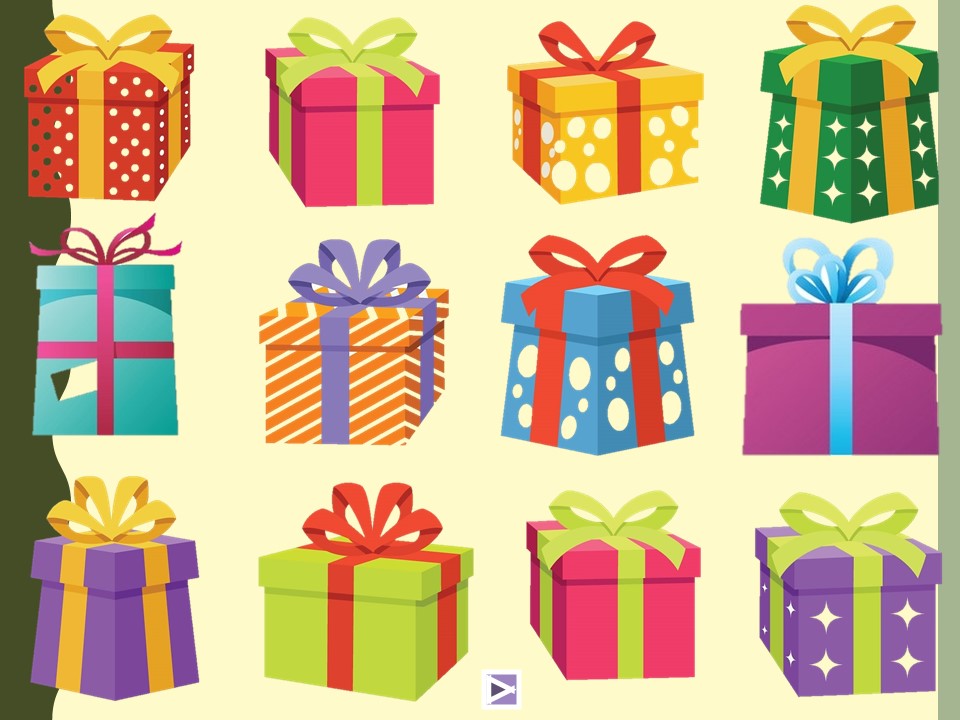 Методика проведения/использования ЭОР педагогом: в этой игре ребенку вместе с мамой необходимо определить, какие два подарка из всех изображенных на слайде являются одинаковыми (то есть найти «пару») и выбрать их, щёлкнув по ним мышкой. Если подарки выбраны верно, то прозвучит звук колокольчиков. Для того, чтобы перейти к следующему заданию, нужно нажать на стрелку внизу слайда.