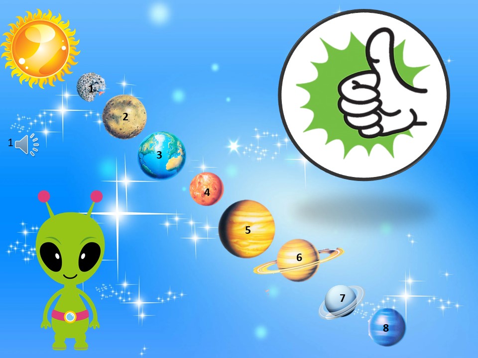 Методика проведения: ребёнку предлагается расставить планеты Солнечной системы по порядку, нажатием на планету ребёнок переносит её в нужном порядке.