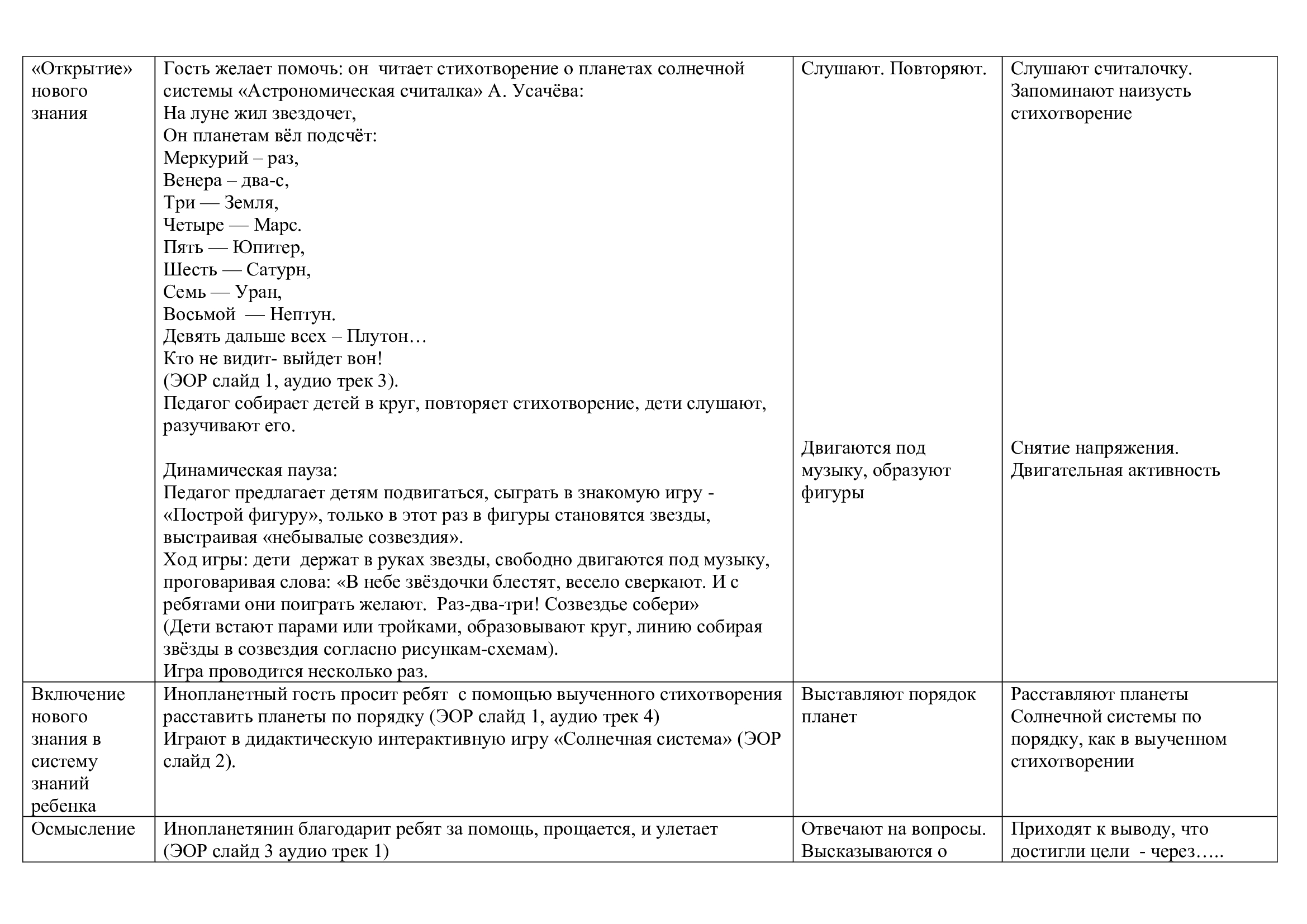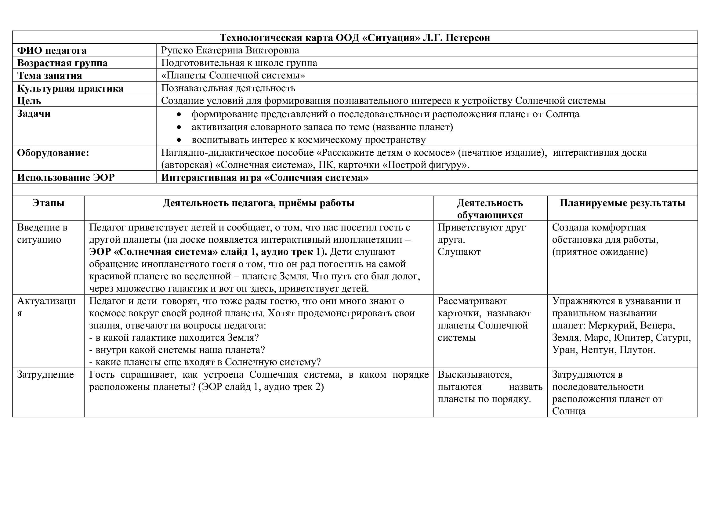 Технологическая карта, проведенного занятия воспитателем Рупеко Е.В., на тему «Планеты Солнечной системы» с использованием ЭОР «Солнечная система»