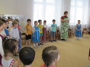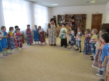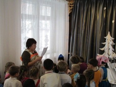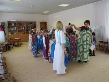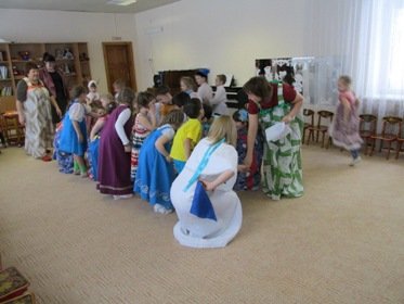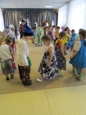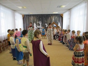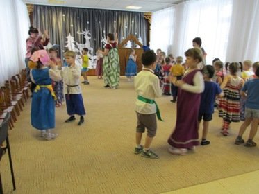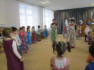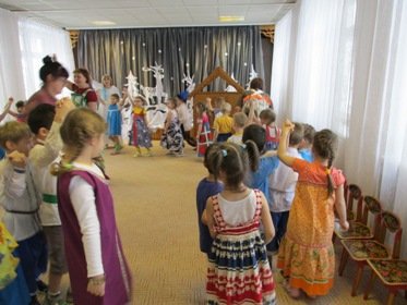 Ребята прошли в музыкальный зал и начали народные гуляния. Ребята организовали круг и прочитали стихотворения о зимних месяцах и позвали в гости саму Зимушку-Зиму.