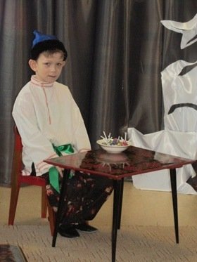Затем ребятишки начали колядовать! Сначала зашли к тётушке Агафье и прочитали дружно и весело ей колядки, за что и получили вкусное угощение. Затем колядовщики пошли к деду Ивану, который тоже порадовал их сладостями.
