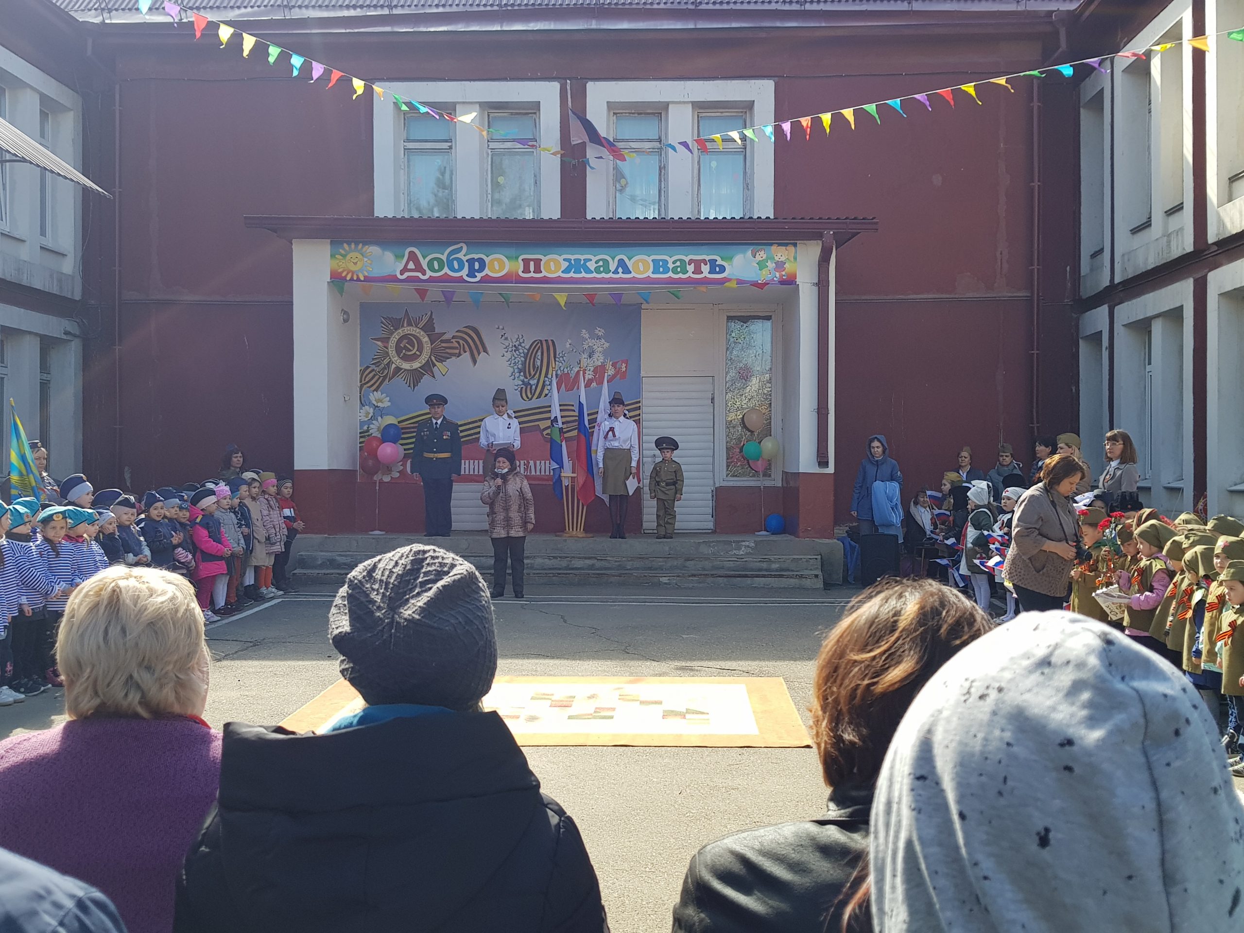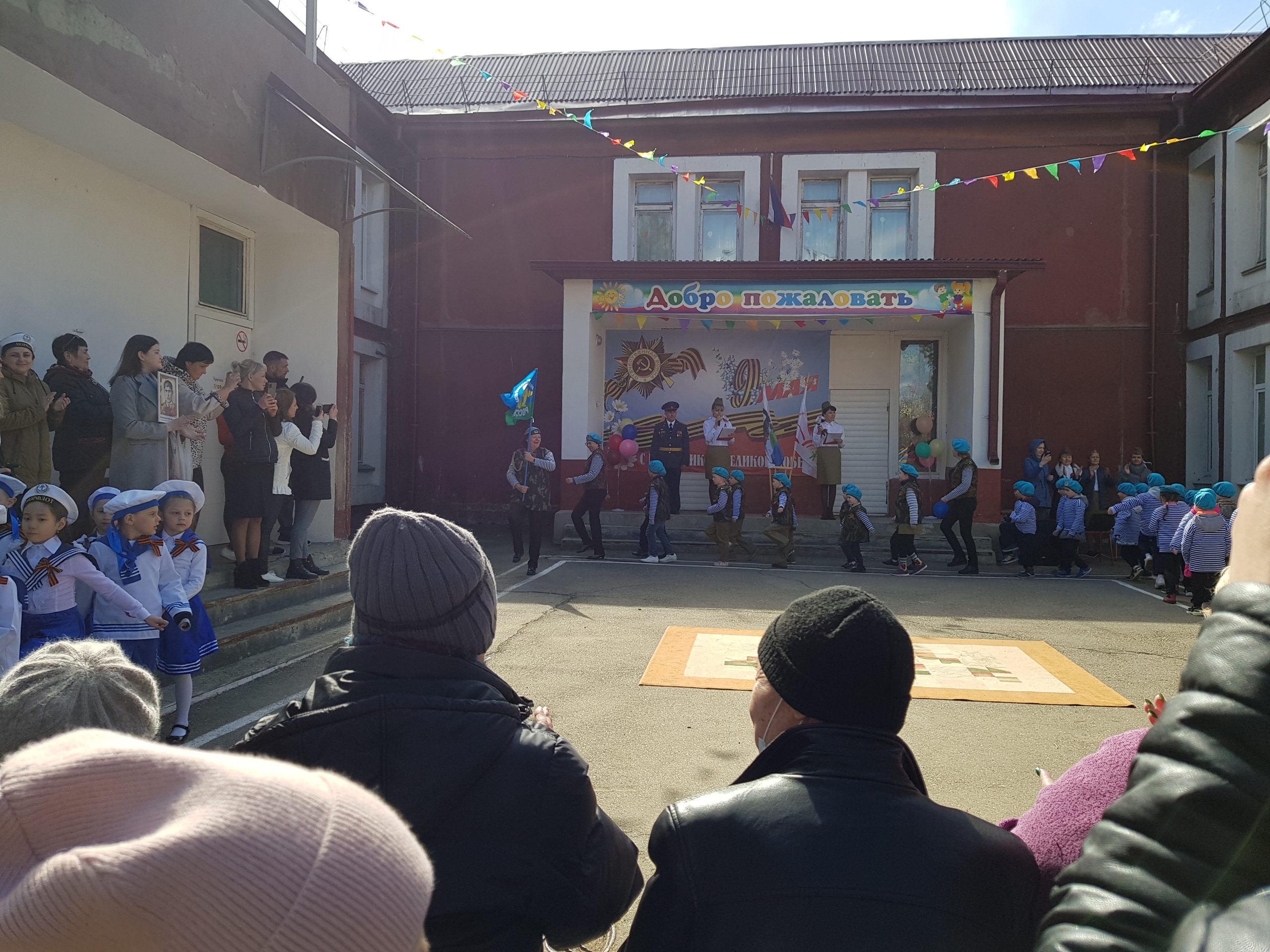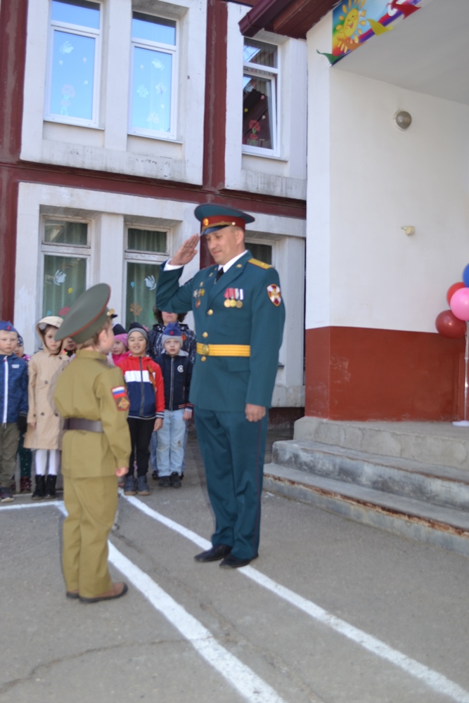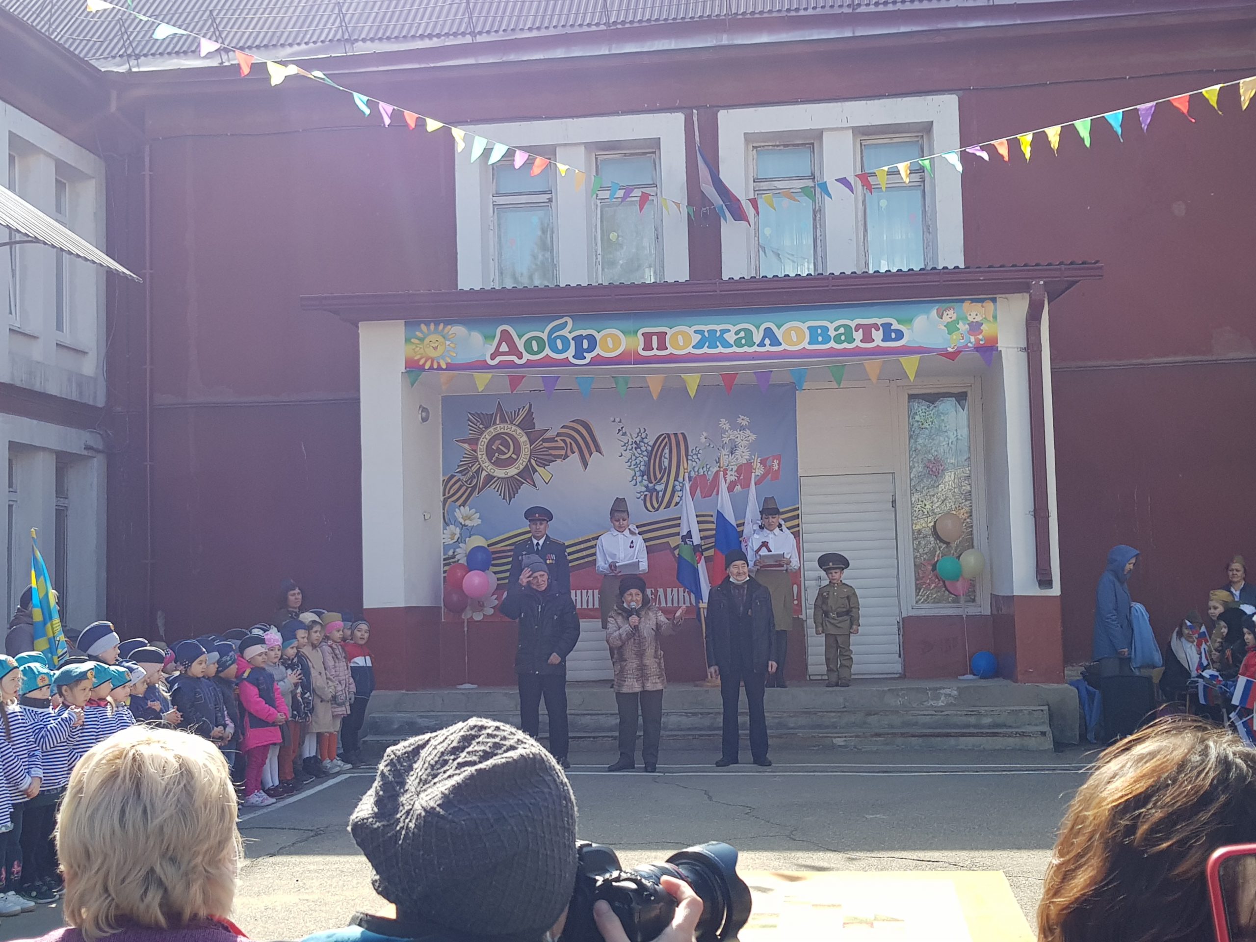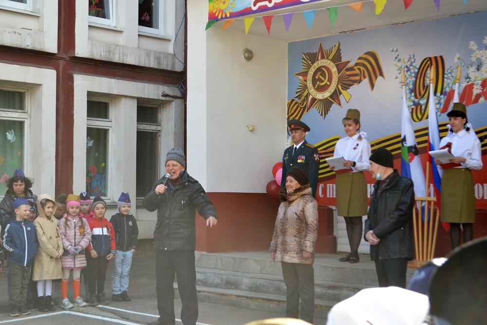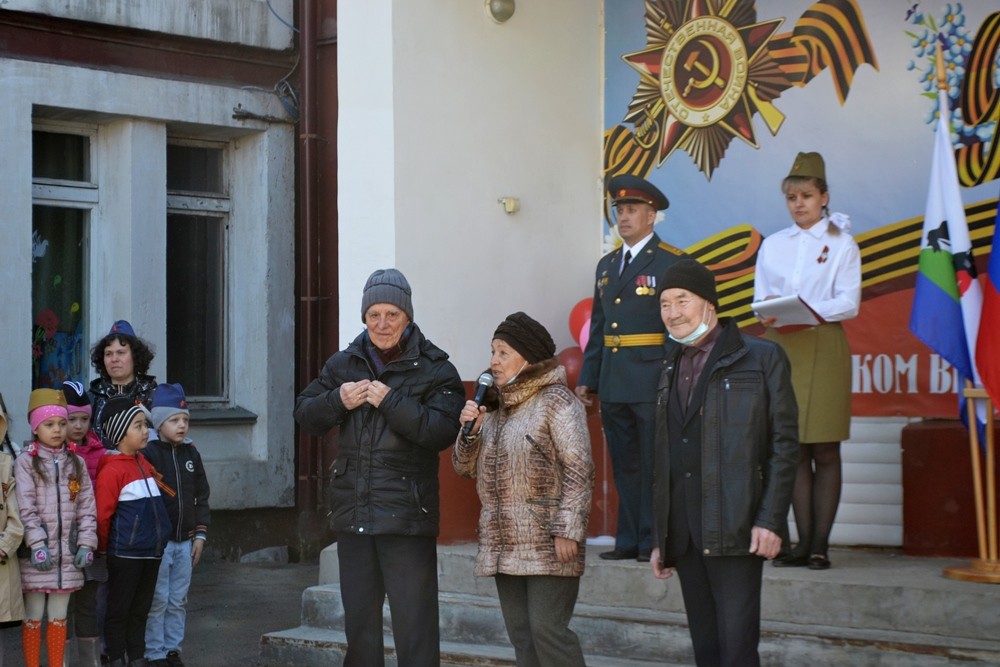 Галина Ивановна и ветераны поприветствовали участников Парада, поздравили с великим праздником — Днём Победы, затем Виктор Иванович немного рассказал о себе и сказал напутственные слова нашим воспитанникам. А Геннадий Афанасьевич, заслуженный артист республики Бурятия и лауреат Всероссийских конкурсов артистов-чтецов в г. Санкт-Петербурге, очень эмоционально и выразительно прочитал стихи для детей детского писателя С.Я. Маршака «Гиппопотам».