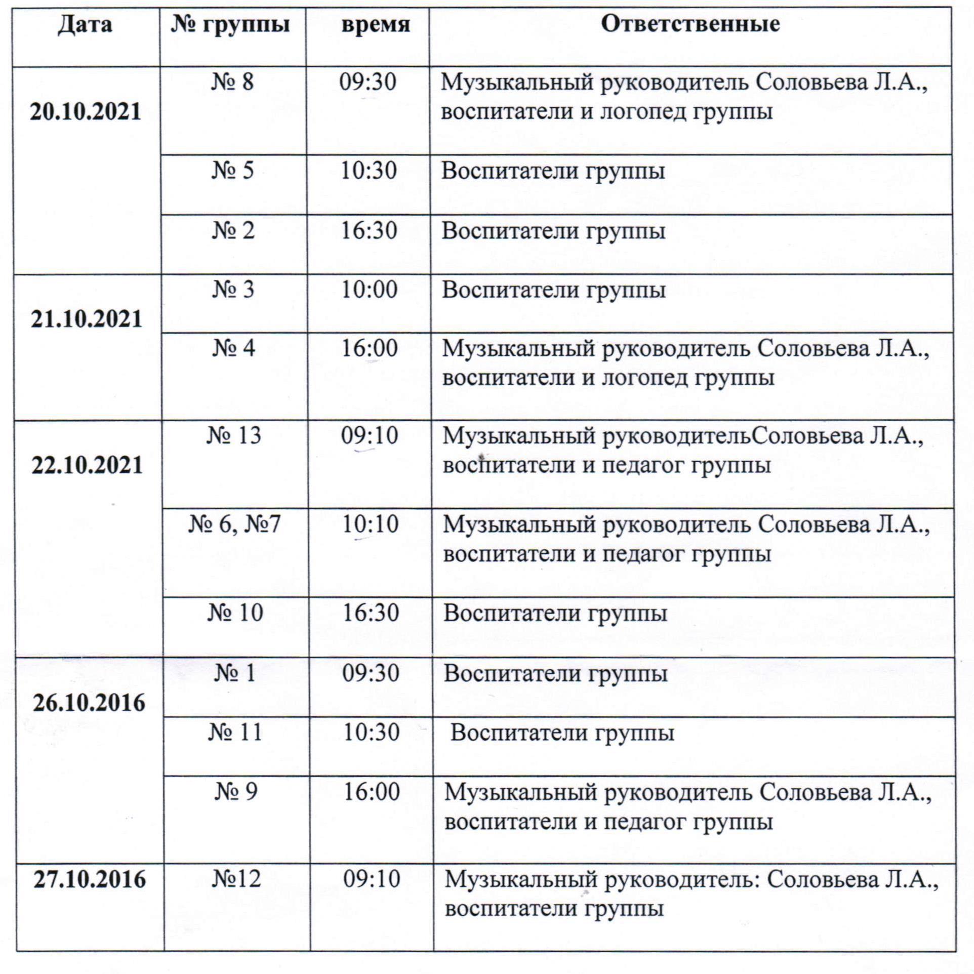 График проведения Осенних праздников в 2021-2022 учебном году