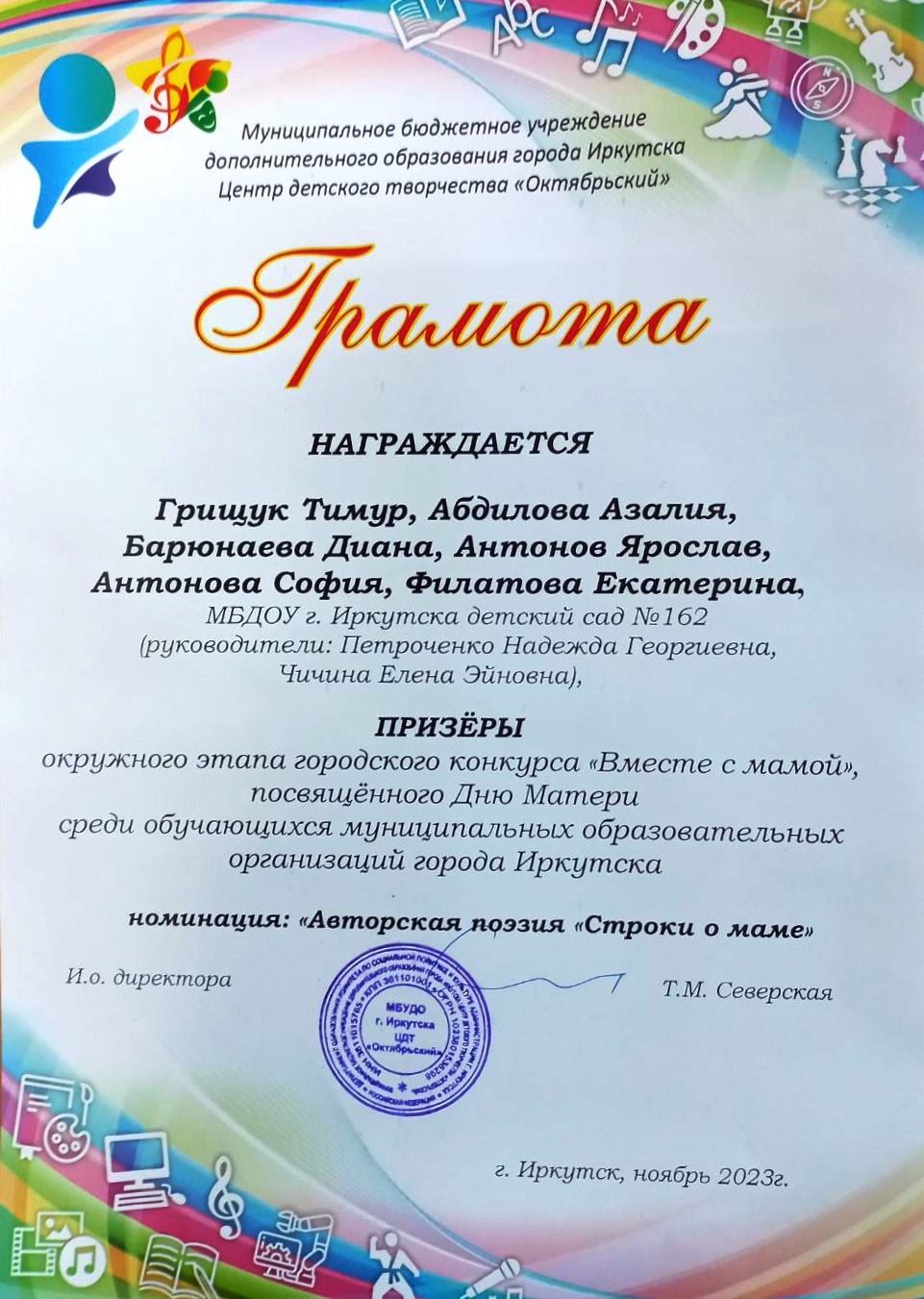 Наши педагоги также приняли участие в этом конкурсе. Петроченко Надежда Георгиевна, учитель-дефектолог и Чичина Елена Эйновна, воспитатель и их воспитанники с нарушениями слуха Тимур Г., Азалия А., Диана Б., Ярослав и София А., Екатерина Ф. стали призёрами в номинации «Авторская поэзия «Строки о маме».