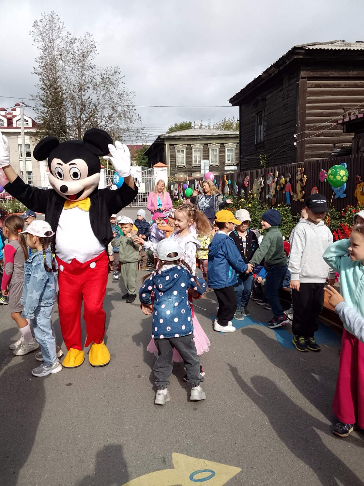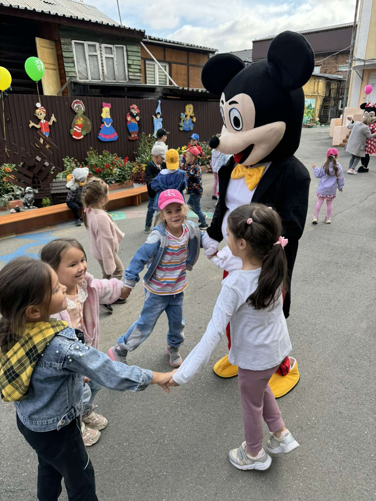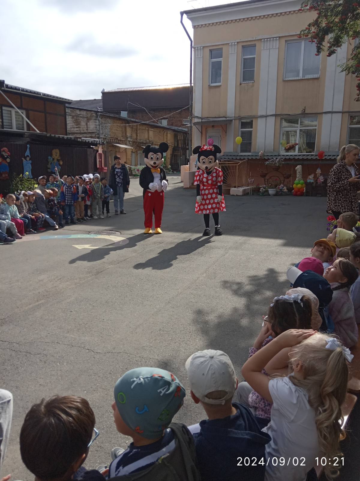 К детям в гости пришли весёлый Микки Маус и Минни Маус. Они играли с детьми в игры, танцевали, читали стихи про День Знаний, веселились.