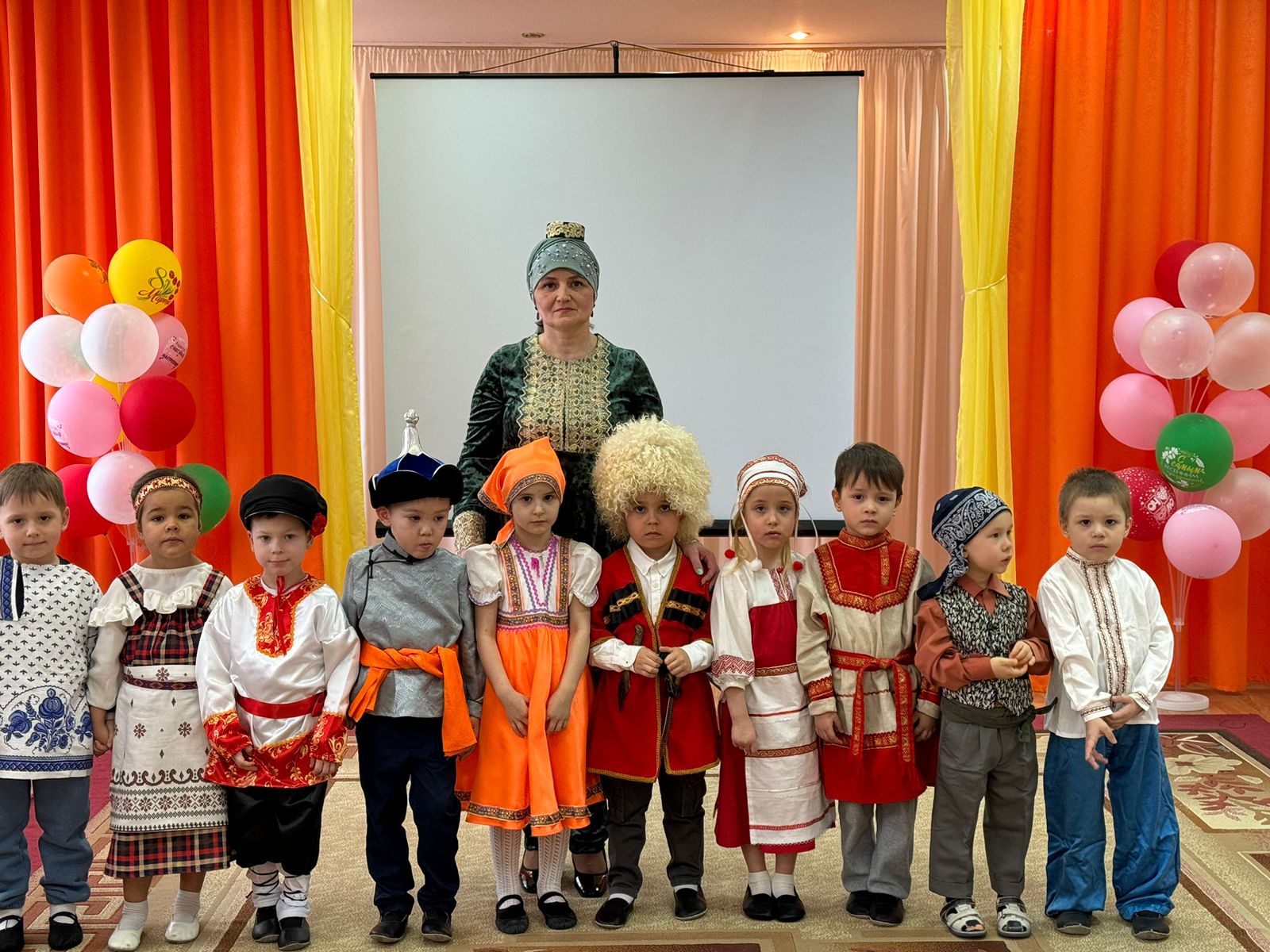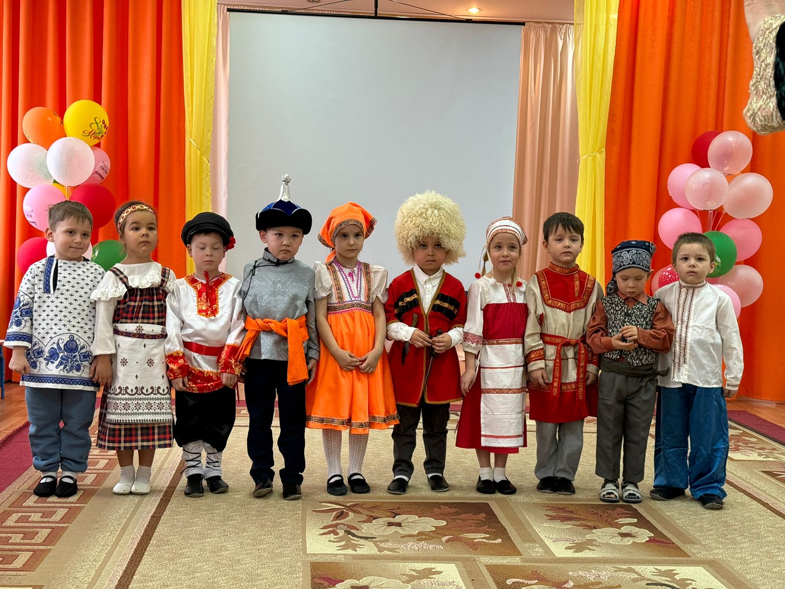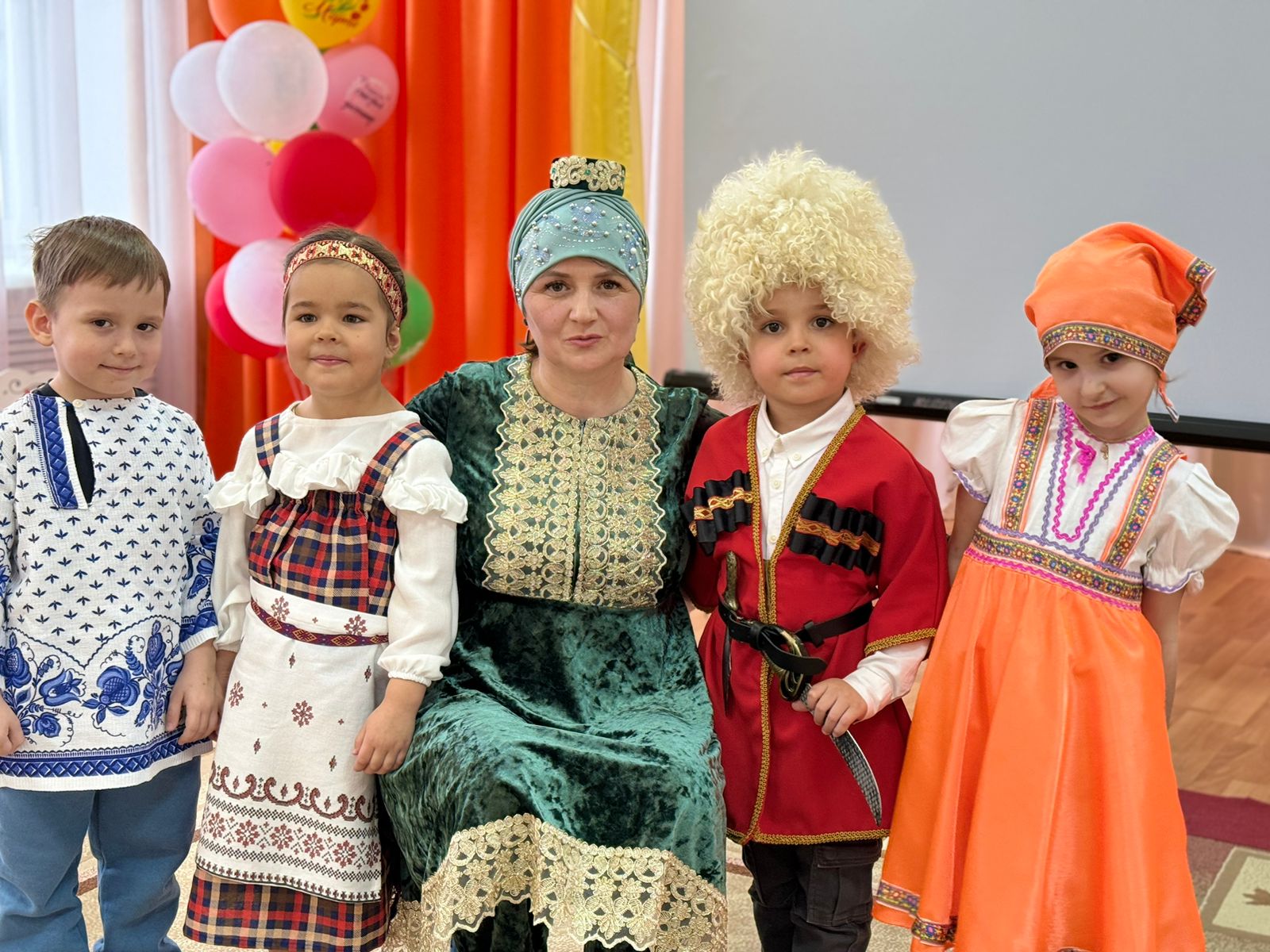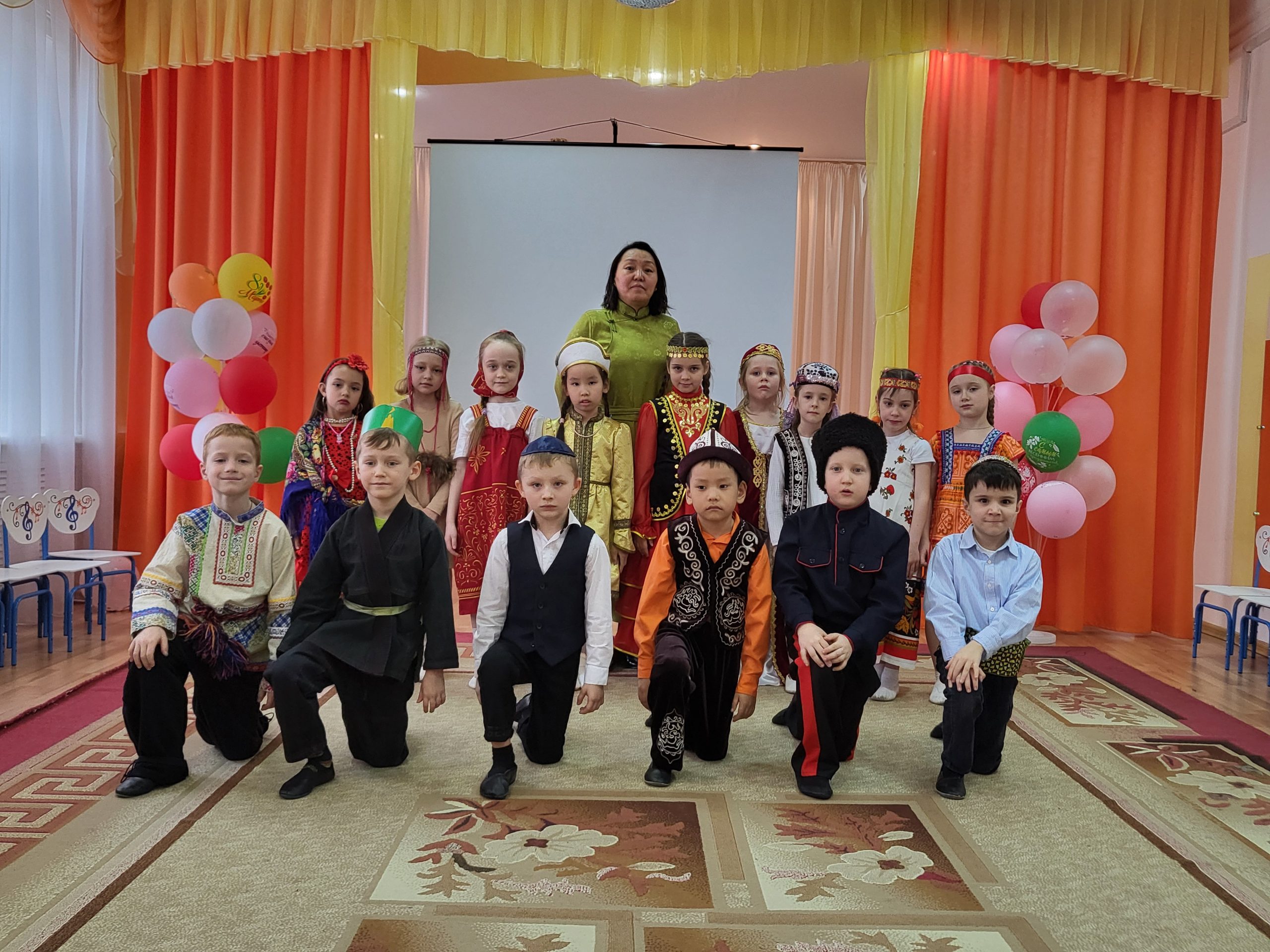В преддверии этого праздника в ДОУ старшая группа «Сказка» и подготовительная группа «Светлячки» провели тематическое мероприятие «Дружба народов». Целью данного мероприятия было расширить представление детей о государственном празднике — День народного единства, воспитать чувство гордости за свою страну, любовь к Родине, уважительное отношение к различным народам нашей России. Были представлены детьми костюмированное представление народов, проживающих на территории России, в частности в городе Иркутске.
