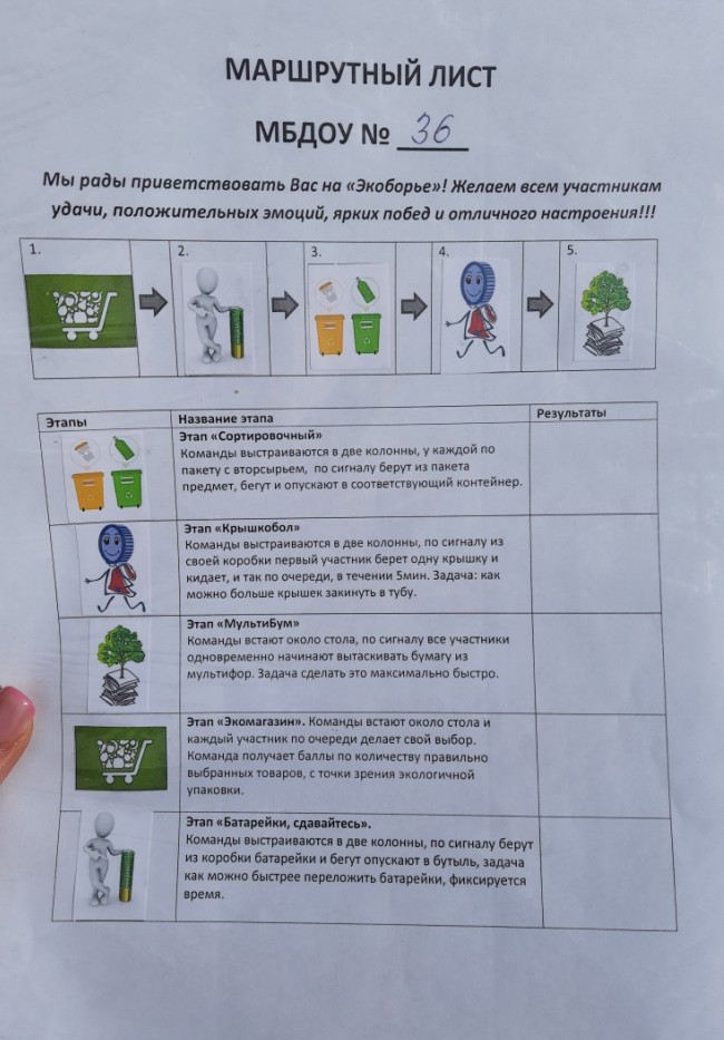 В рамках конкурса в детском саду проводились занятия по экопросвящению, все возрастные группы активно собирали пластиковые крышечки, макулатуру и батарейки! Родители присылали фото и видеоролики, в которых дети рассказывали о своих экопривычках и последним испытанием было соревнование детских команд в «Экоборье». Дети с удовольствием участвовали в эстафетах, сортировали мусор, испытывали себя на меткость и быстроту. Завершилось мероприятие подведением итогов.