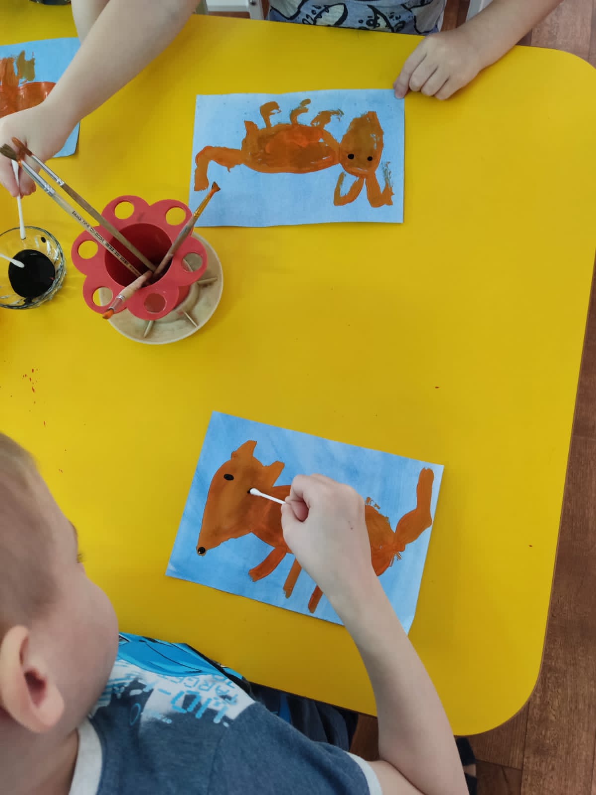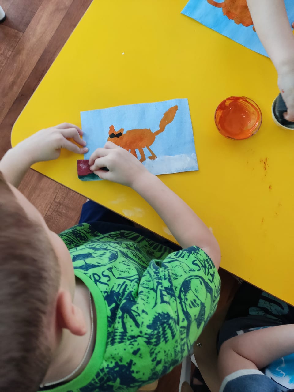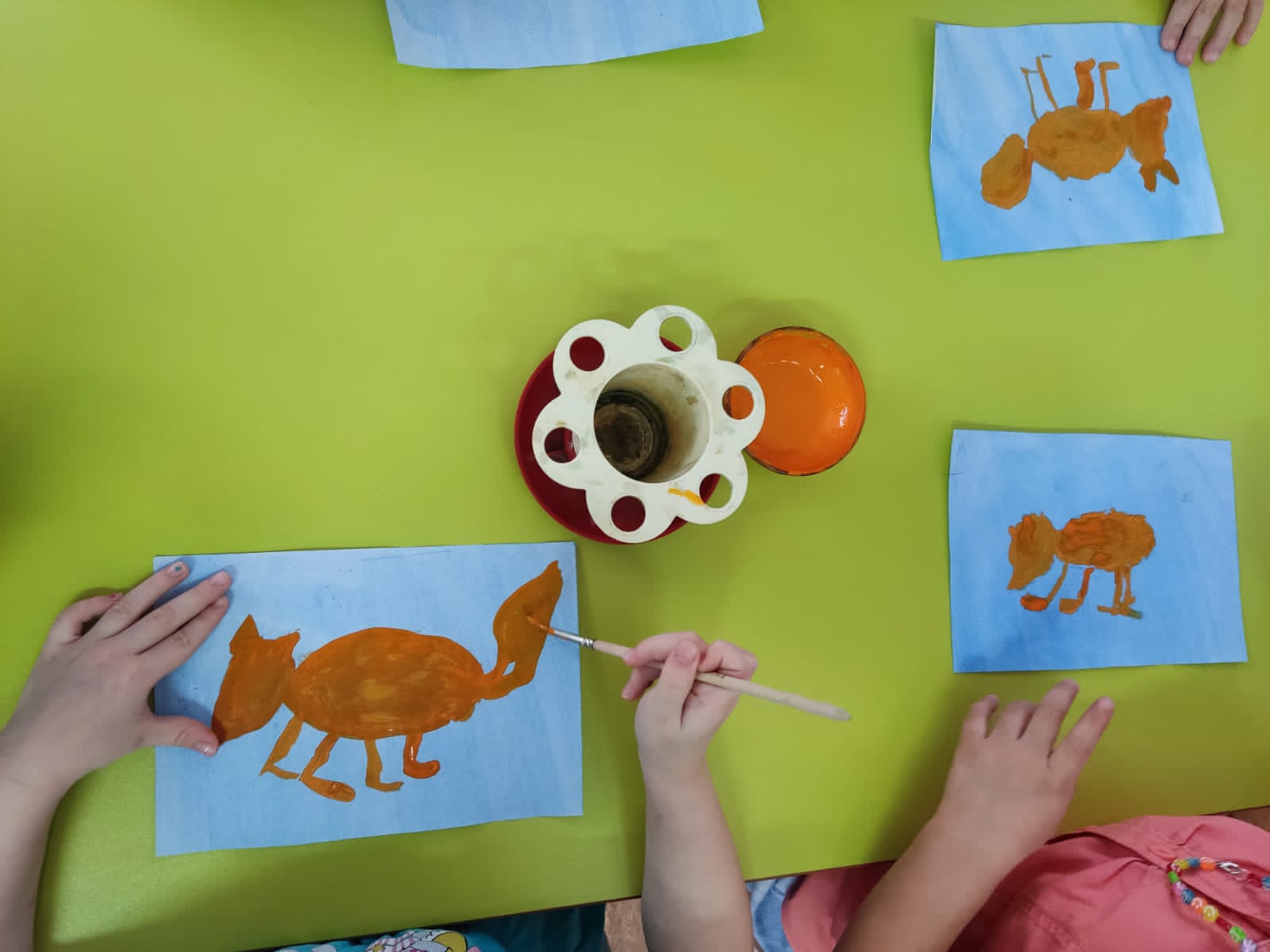 Цель: учить детей рисовать лису, используя знакомые приёмы рисования овала, треугольника и добавления деталей (ушки, глазки, носик, лапы, хвост), формировать эстетическое восприятие.