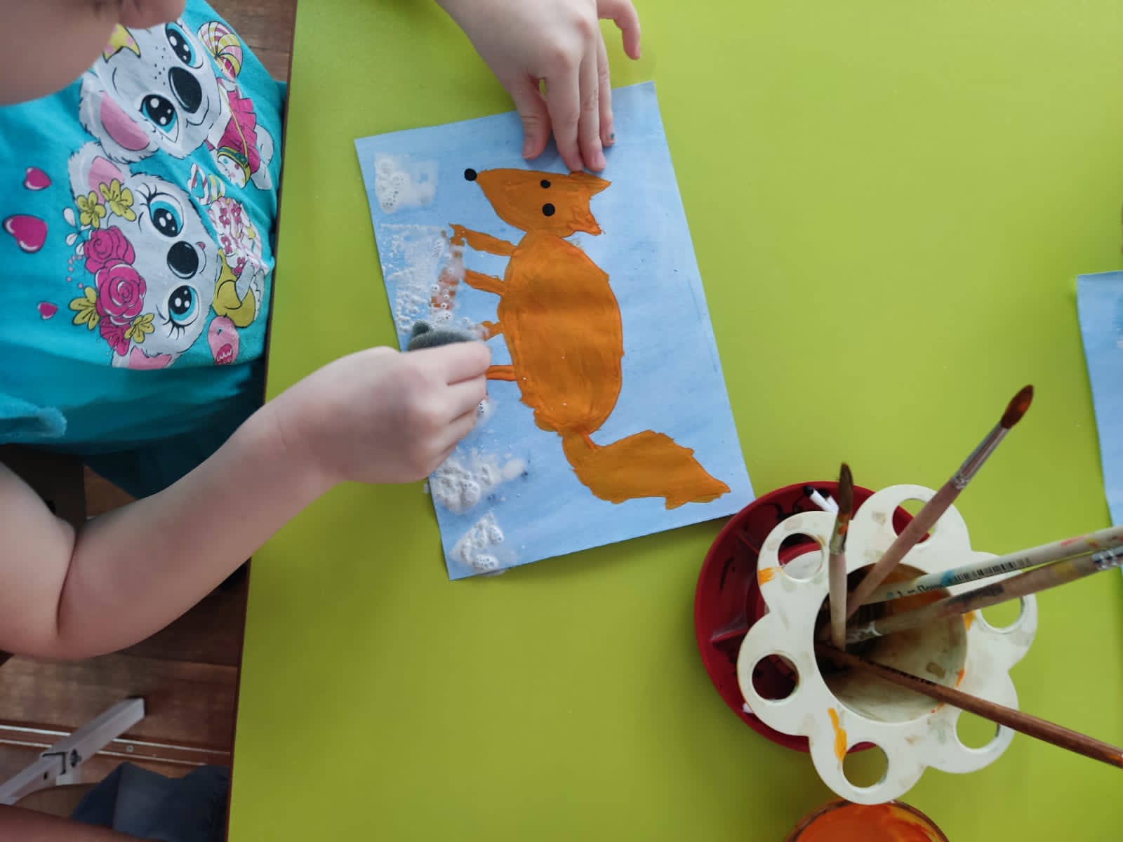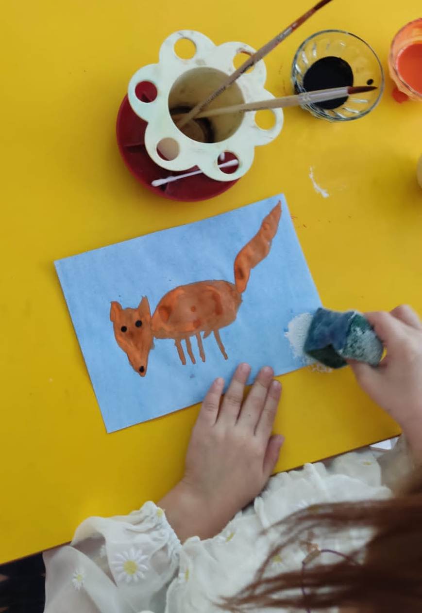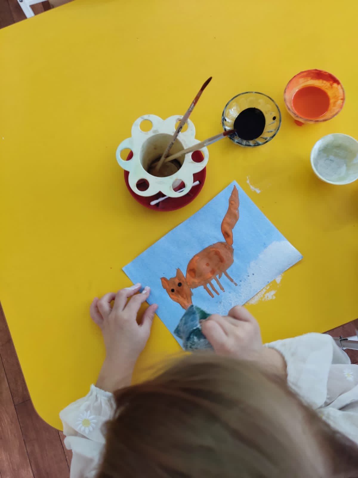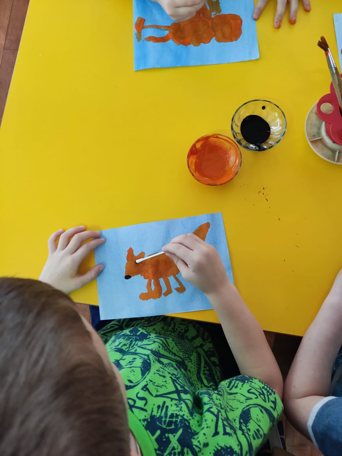 Цель: учить детей рисовать лису, используя знакомые приёмы рисования овала, треугольника и добавления деталей (ушки, глазки, носик, лапы, хвост), формировать эстетическое восприятие.