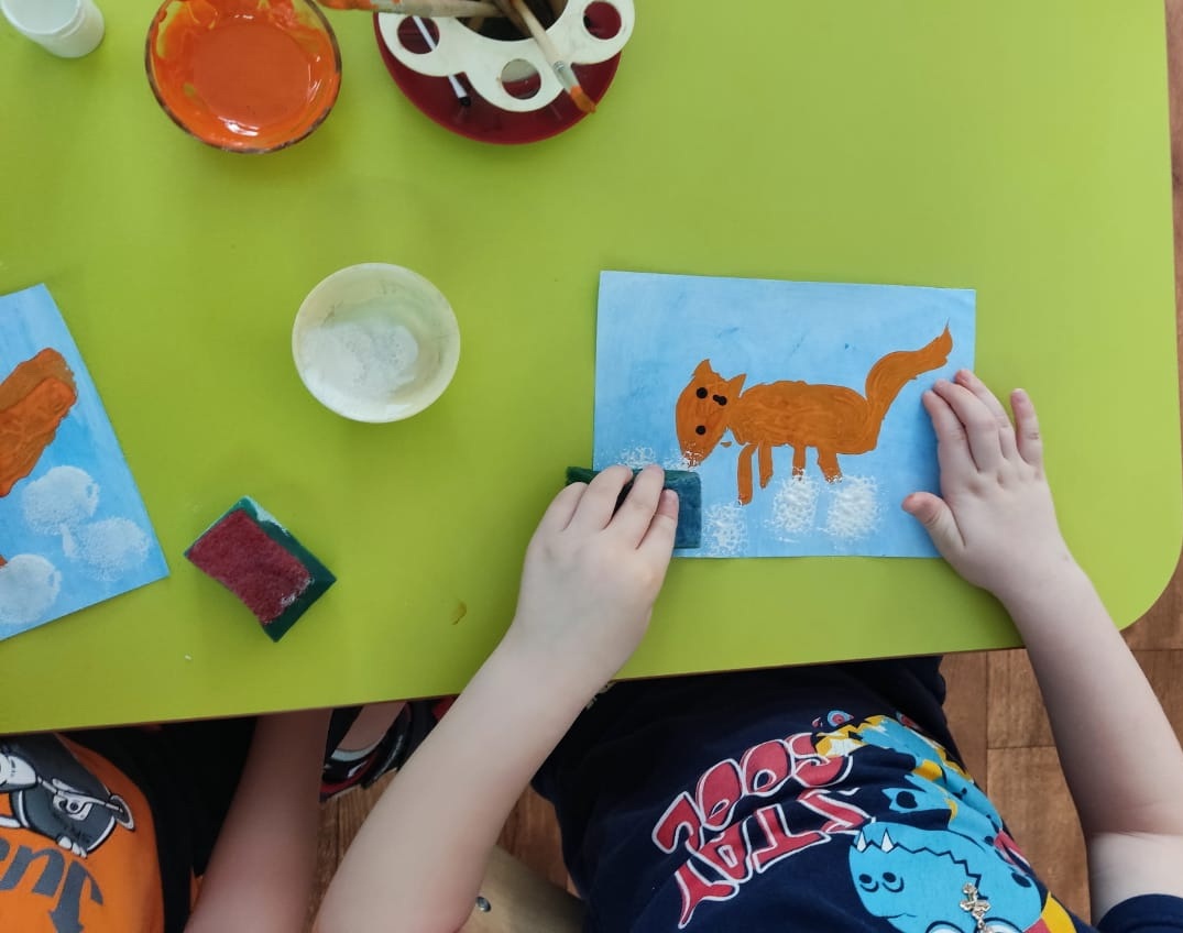 Материалы и оборудование: листы бумаги, тонированные в голубой цвет, гуашь, кисти с мягким ворсом, губки (для изображения снега), ватные палочки,влажные салфетки для рук.