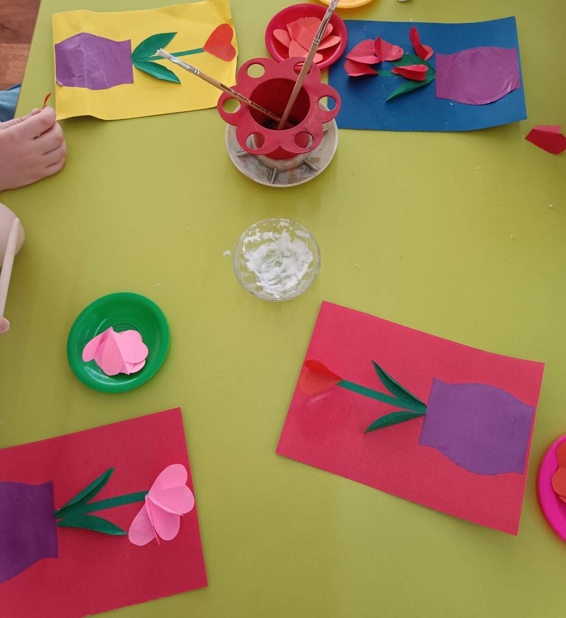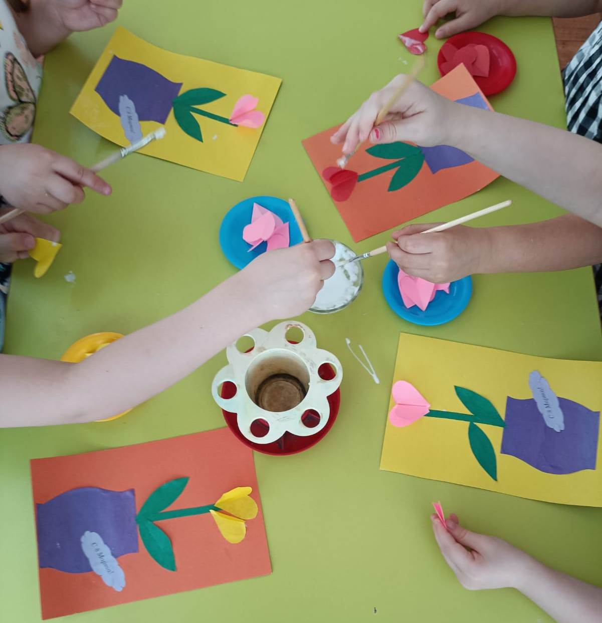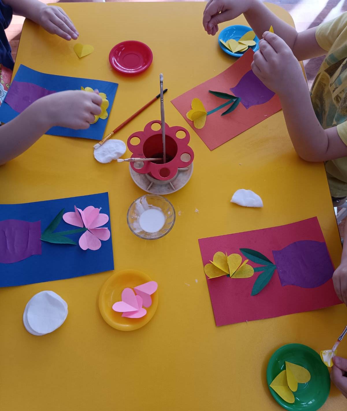 На данном занятии совершенствовали умение детей составлять композицию, продолжали учить работать с клеем, развивать творческие способности, фантазию, мелкую моторику детей. Воспитывали любовь и уважение к близким, родным людям. И вот, что у нас получилось.