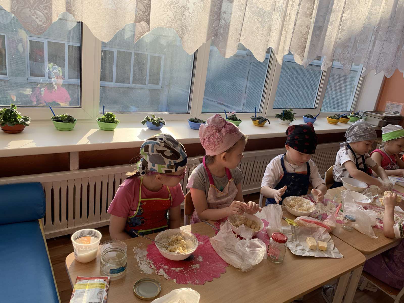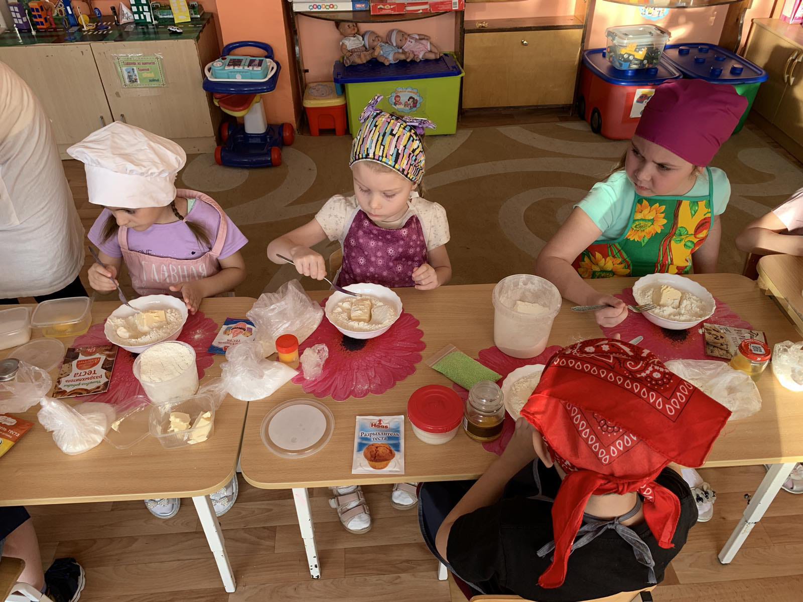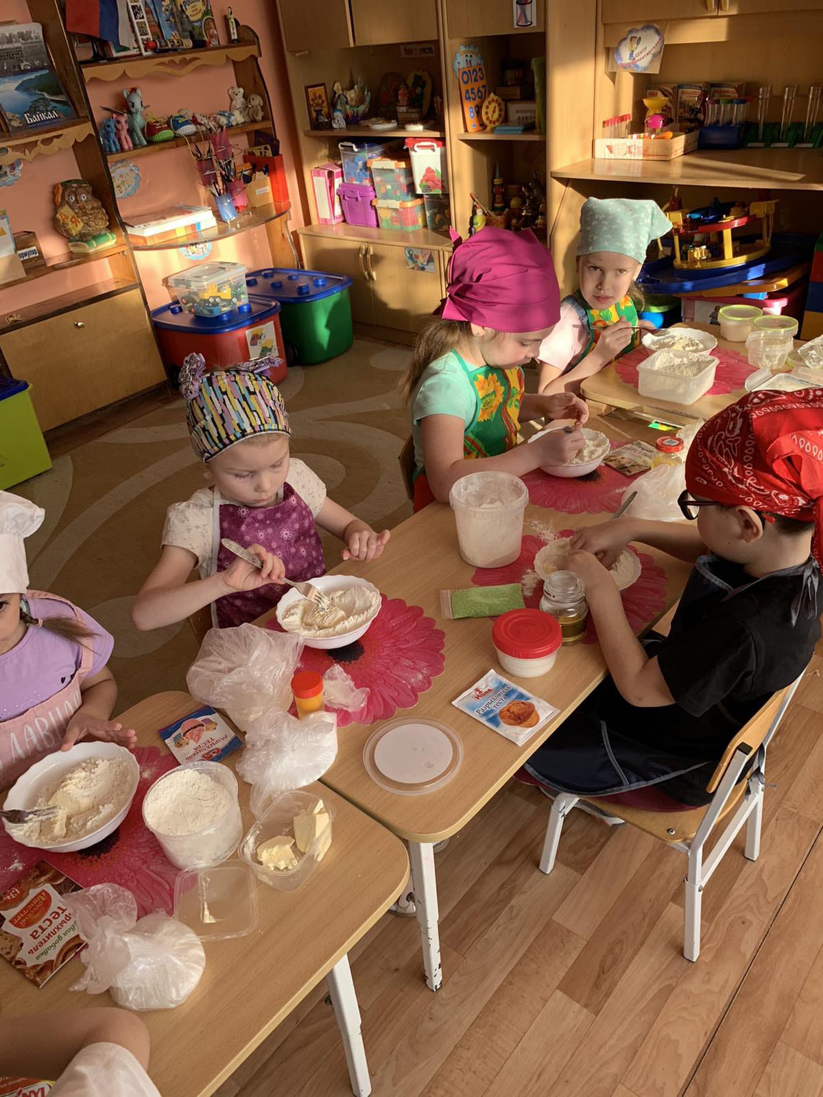 Первым этапом провели беседу о чистоте рук и места, где мы будем работать. Затем познакомили с процессом приготовления печенья. Обогатили словарь детей такими словами как: противень, песочное тесто, разрыхлитель.