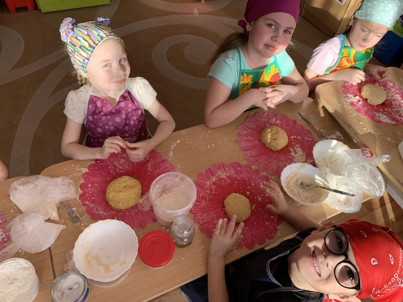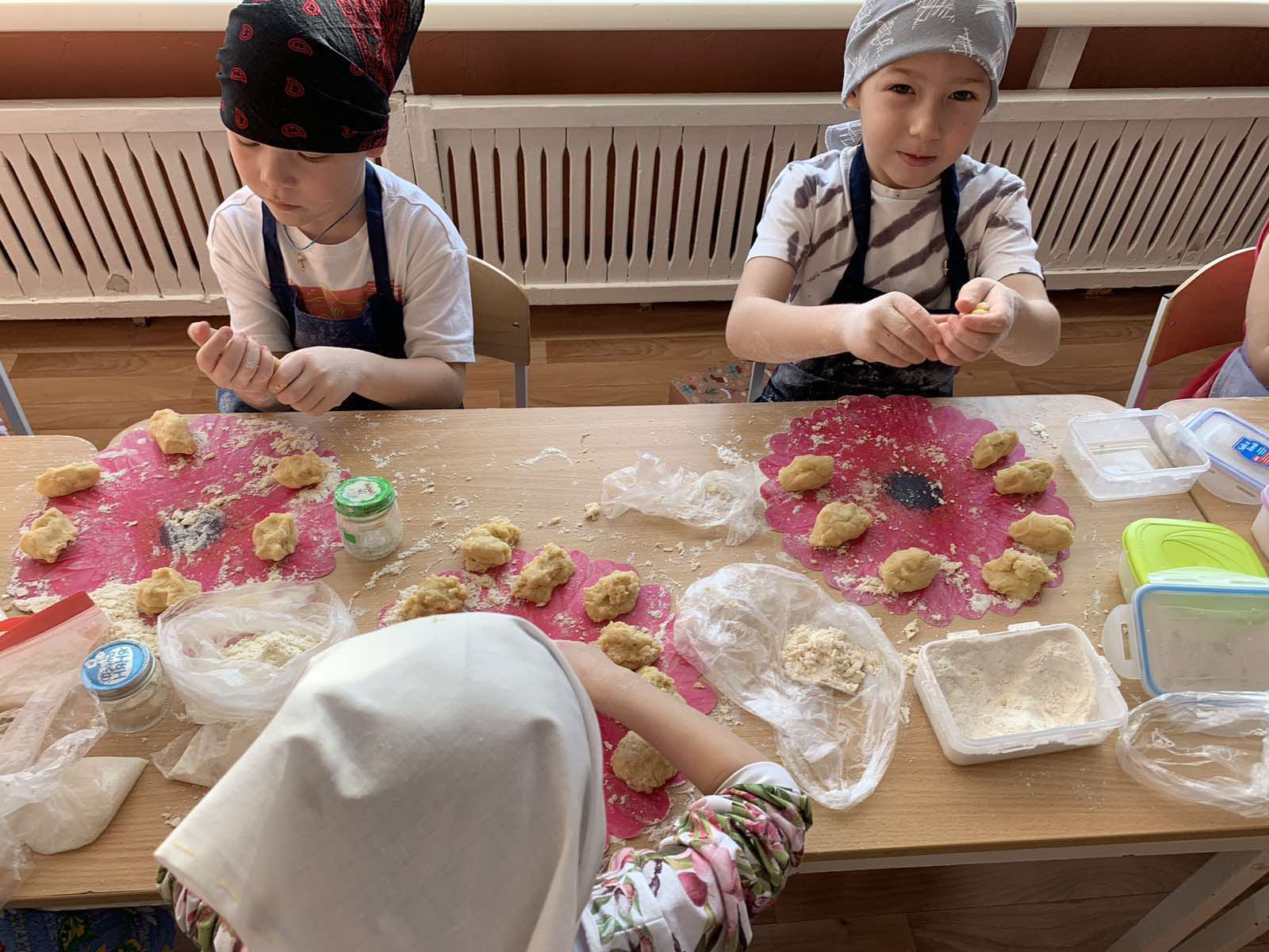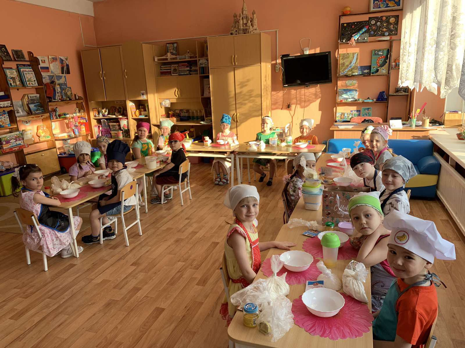 Первым этапом провели беседу о чистоте рук и места, где мы будем работать. Затем познакомили с процессом приготовления печенья. Обогатили словарь детей такими словами как: противень, песочное тесто, разрыхлитель.