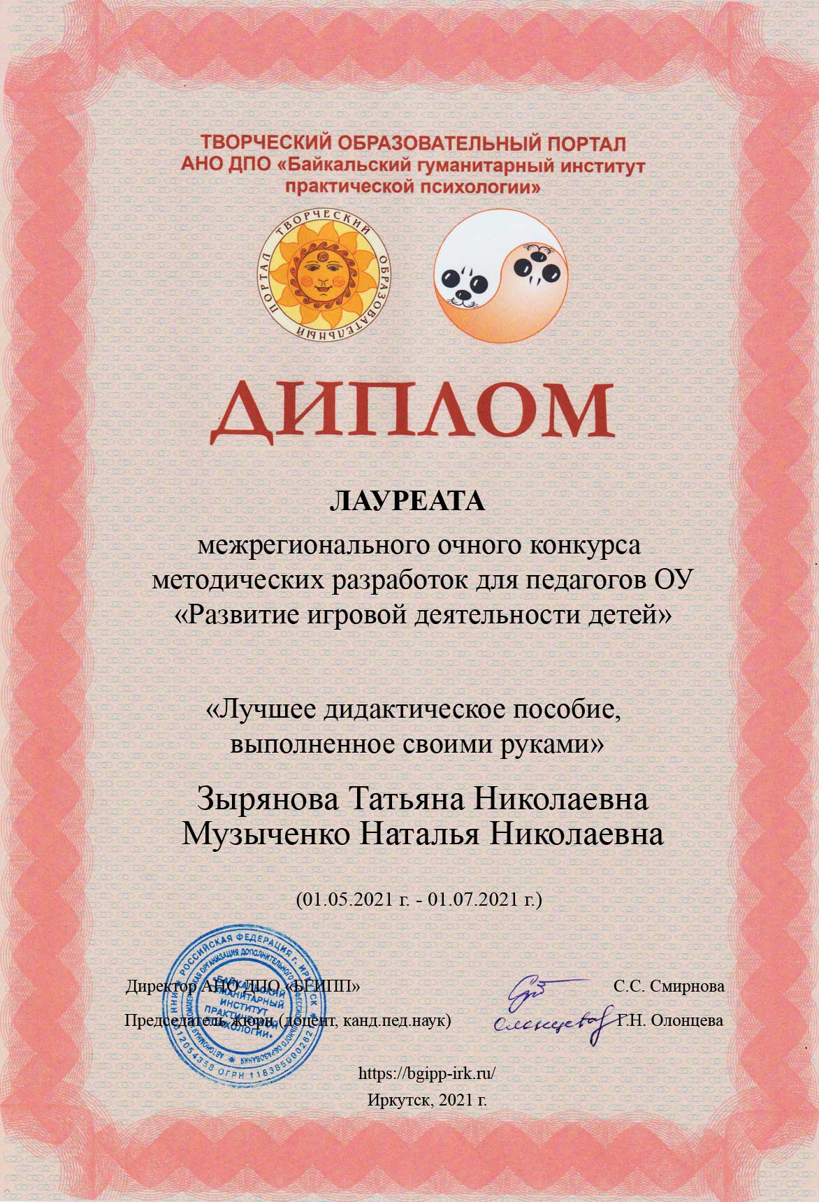 Повышение квалификации: 2009 г., профессиональная переподготовка, Иркутский институт повышения квалификации работников образования, специальность 031800.00 – Логопедия; 2015 г., профессиональная переподготовка, ЧОУ ДПО «Институт новых технологий в образовании», «Педагогика и психология (дошкольное образование)» (520 ч.); 2019 г., МКУ г. Иркутска «ИМЦРО», «Педагогическая деятельность в условиях реализации ФГОС дошкольного образования», (72 ч.).