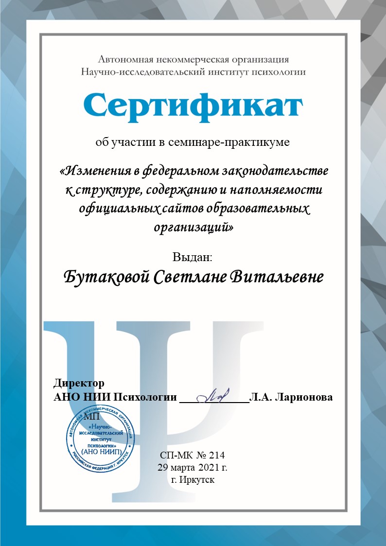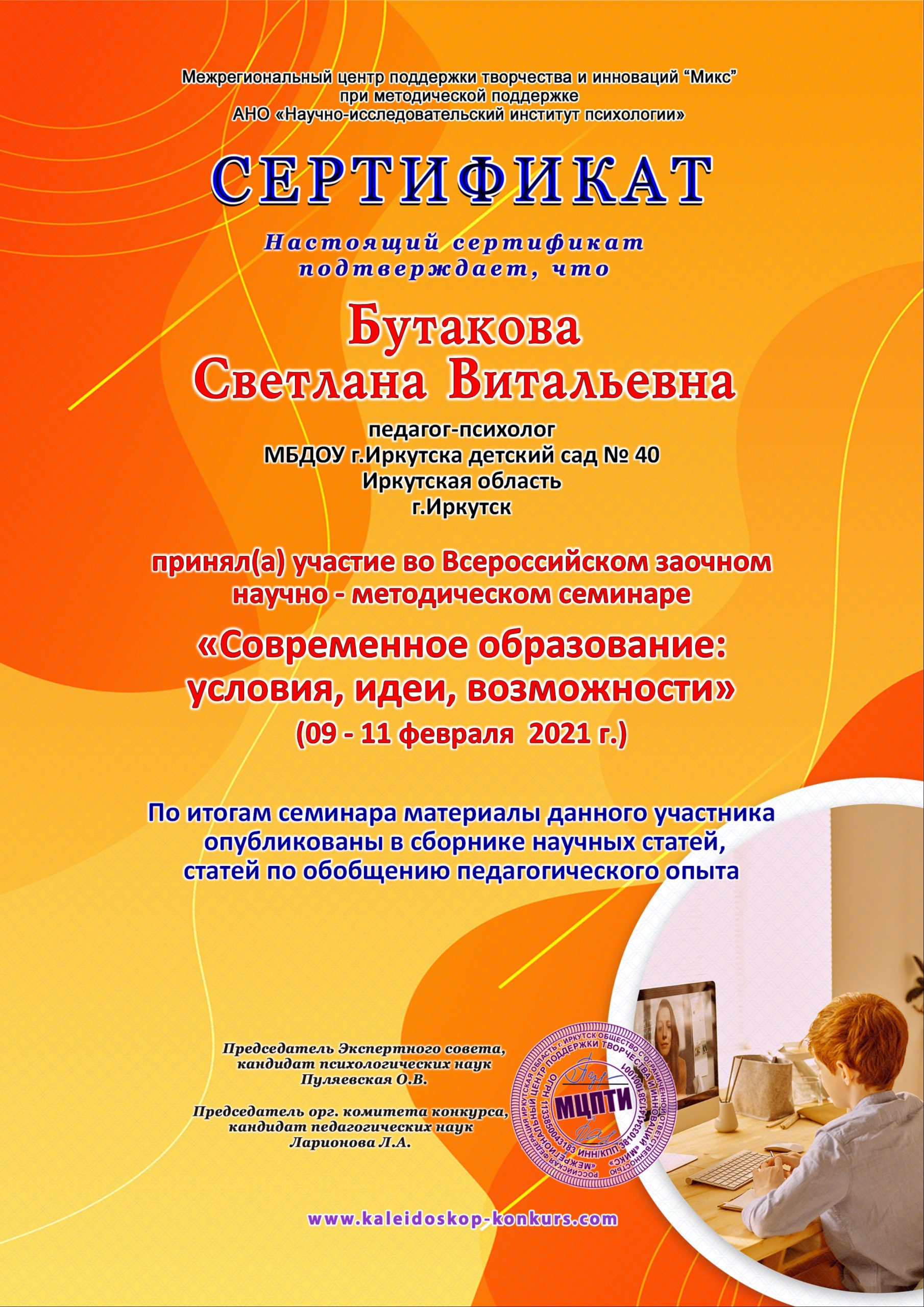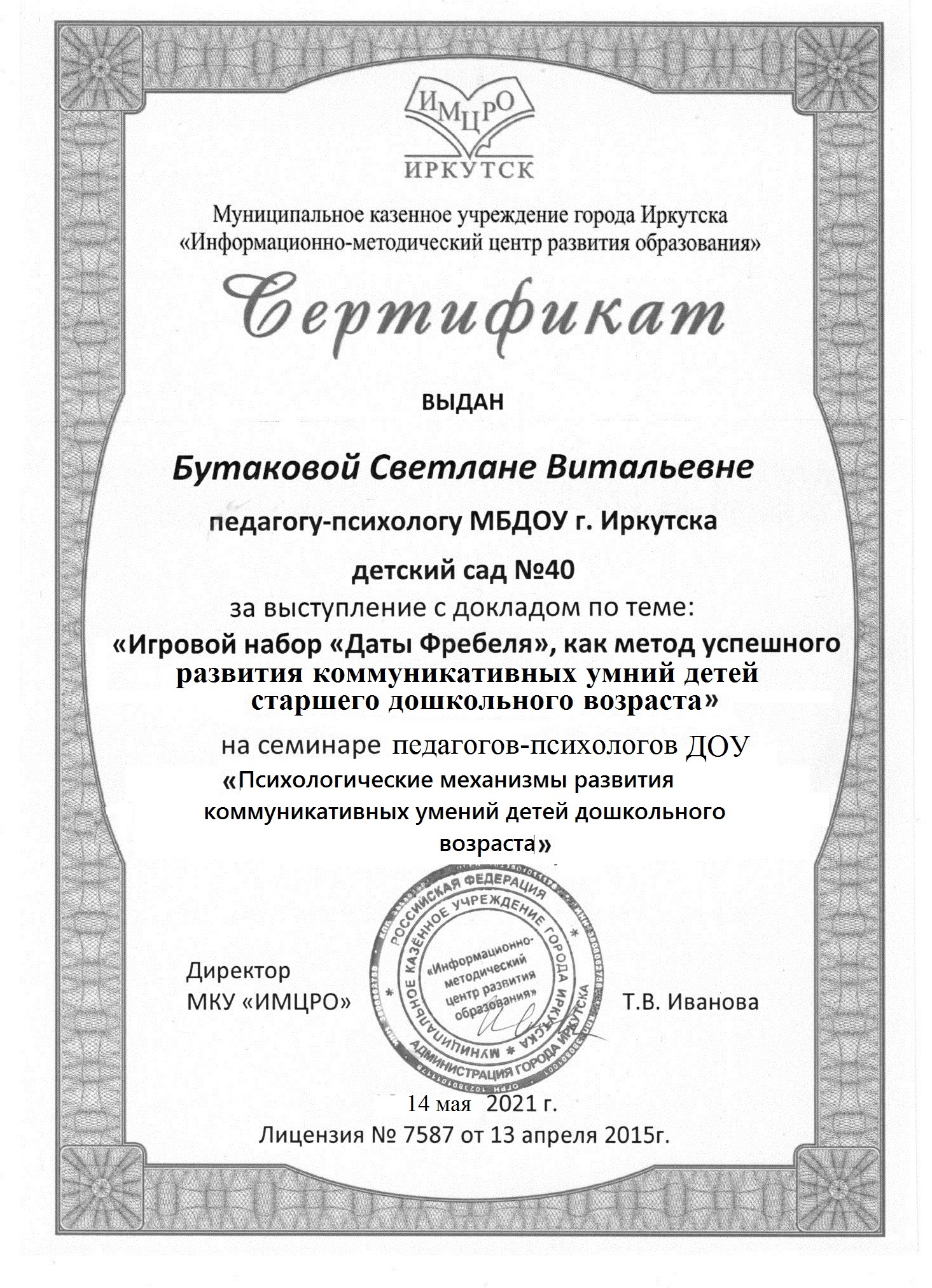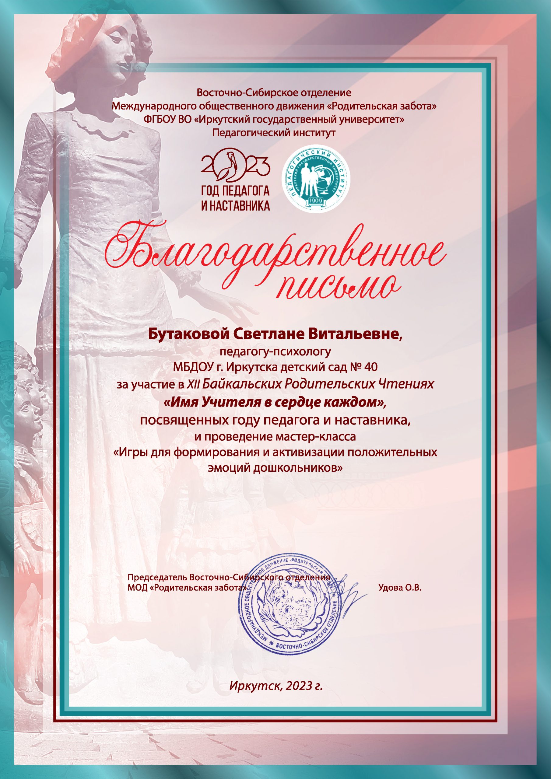Меня зовут Бутакова Светлана Витальевна и я педагог-психолог МБДОУ г. Иркутска детского сада № 40 Я рада Вас приветствовать на своей страничке.