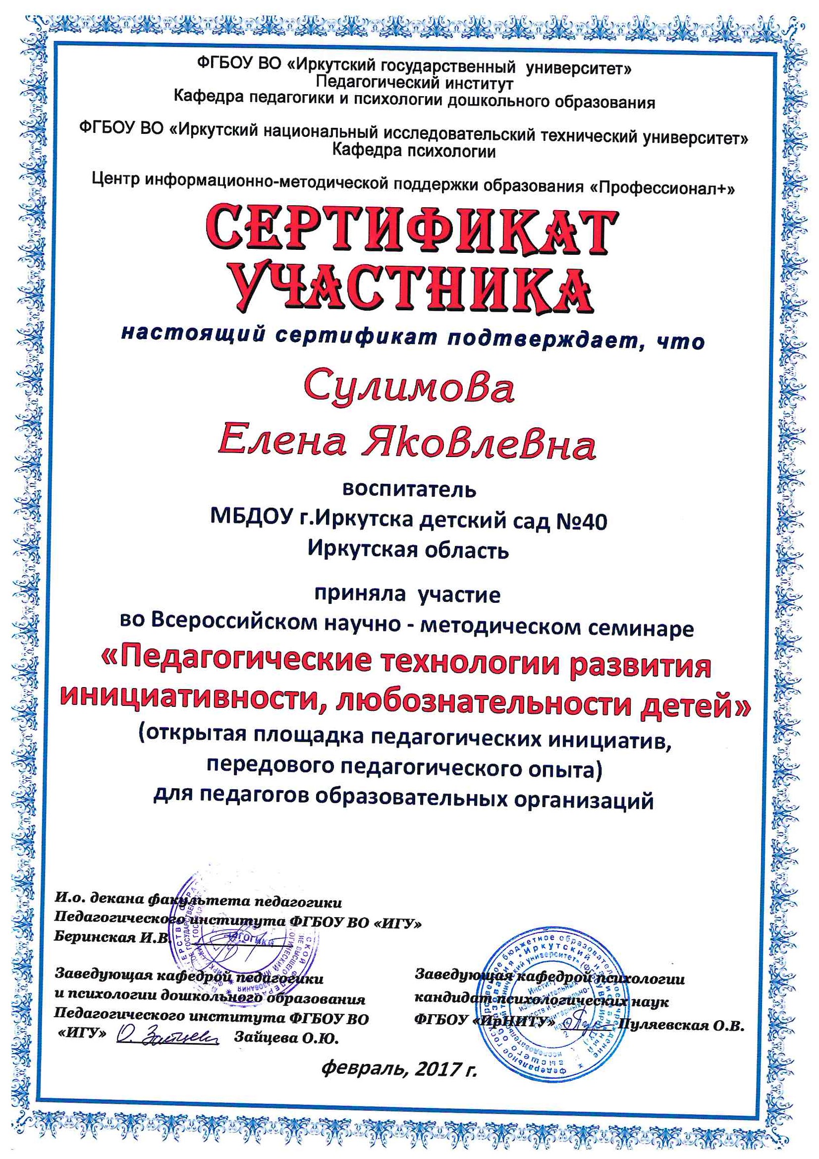 — Сертификат, февраль 2017 г., ФГБОУ ВО «Иркутский государственный университет» Педагогический институт Кафедра психологии и педагогики дошкольного образования, ФГБОУ ВО «Иркутский национальный исследовательский технический университет» Кафедра психологии Центр информационно-методической поддержки образования «Профессионал+», Всероссийский научно-методический семинар «Педагогические технологии развития инициативности, любознательности детей»,