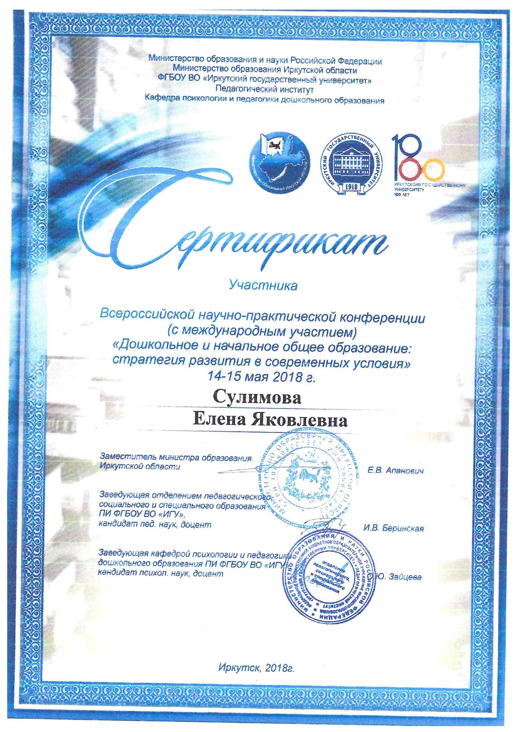 — Сертификат, 14-15 мая 2018 года. Министерство образования и науки Российской Федерации Министерство образования Иркутской области ФГБОУ ВО «Иркутский государственный университет» Педагогический институт Кафедра психологии и педагогики дошкольного образования, Всероссийская научно-практическая конференция (с международным участием) «Дошкольное и начальное общее образование: стратегия развития в современных условиях»