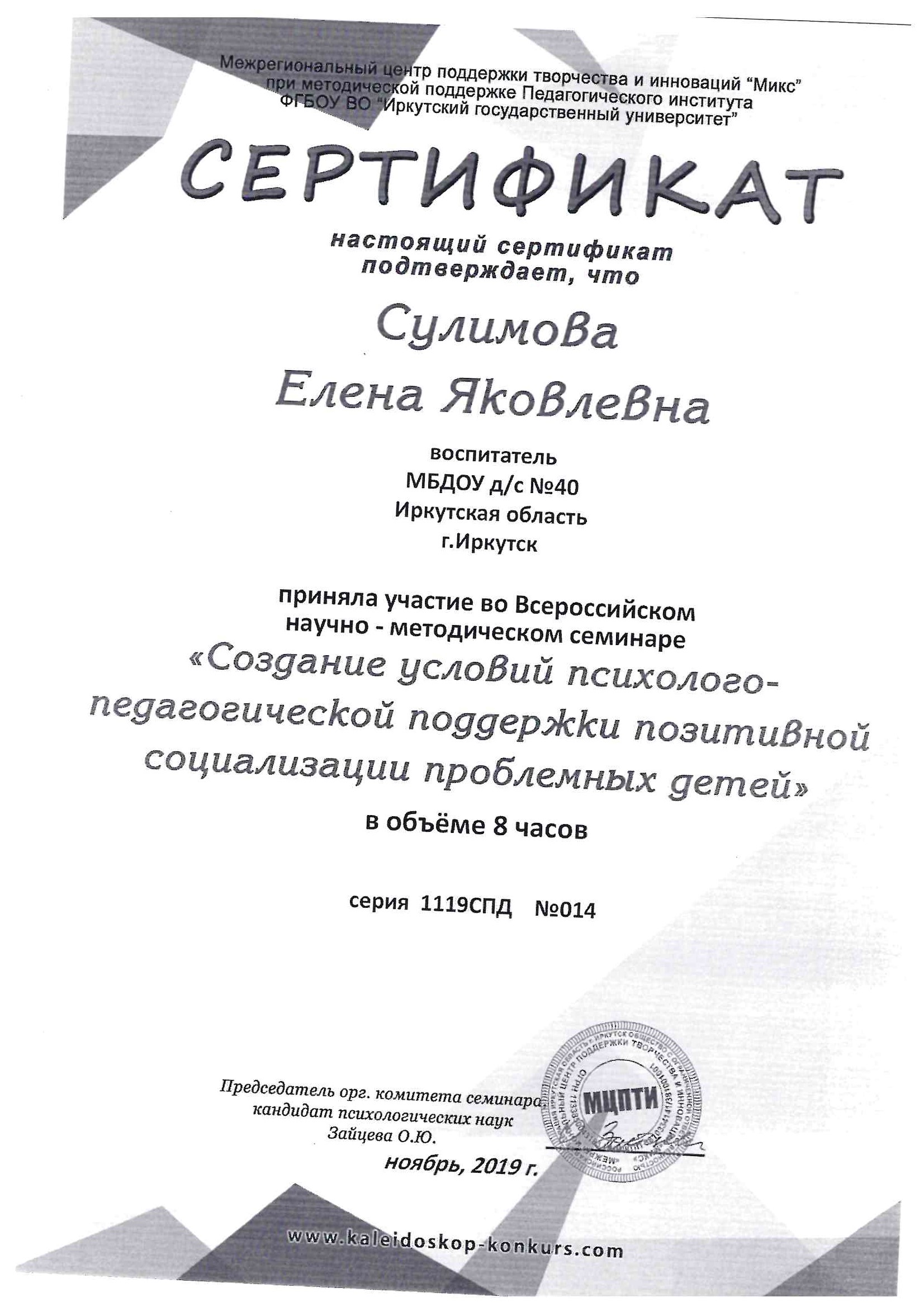 — Сертификат, ноябрь, 2019 г. Межрегиональный центр поддержки творчества и инноваций «Микс» при методической поддержки Педагогического института ФГБОУ ВО «Иркутский государственный университет», Всероссийский научно-методический семинар «Создание условий психолого-педагогической поддержки позитивной социализации проблемных детей», 8 часов;