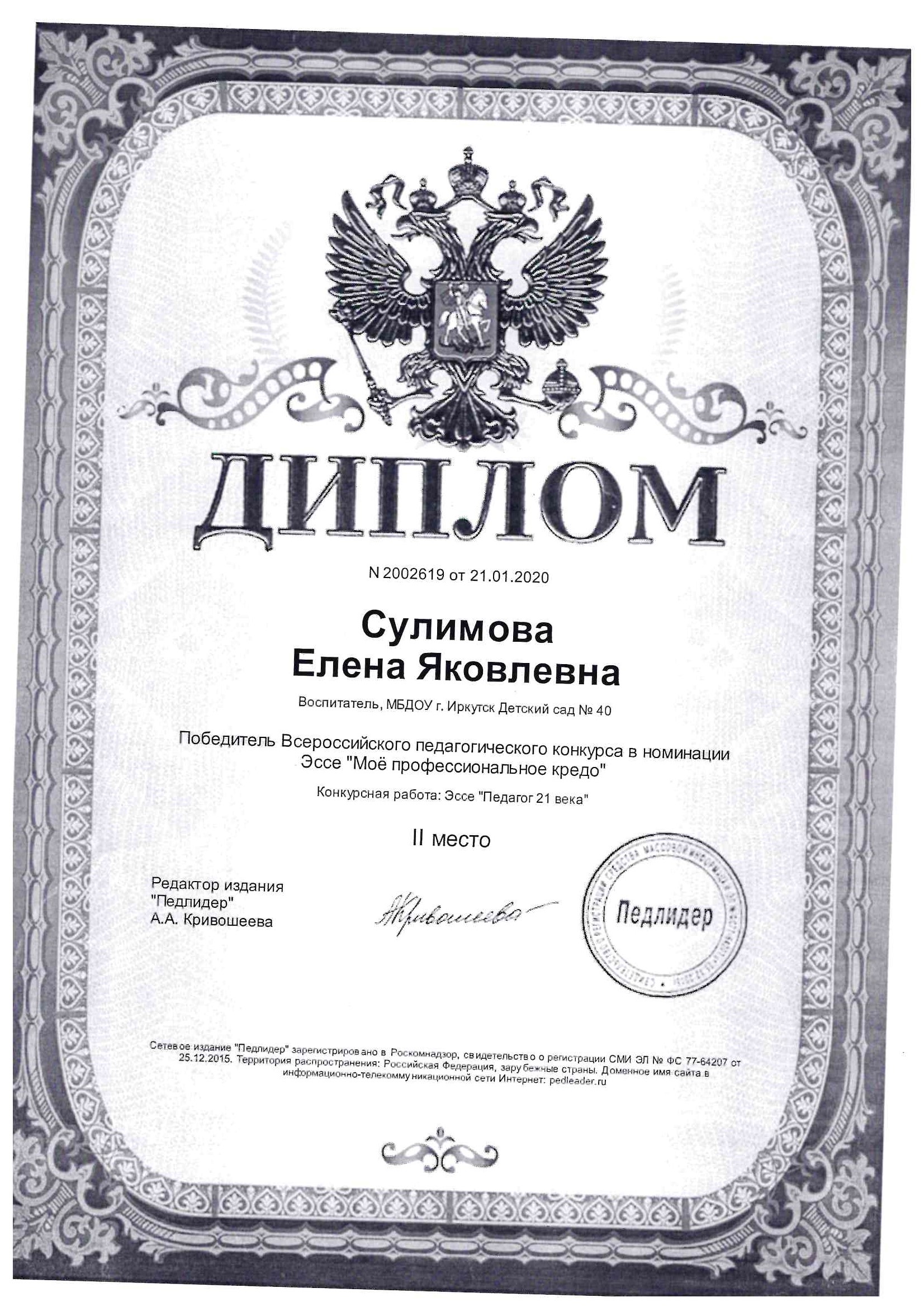 — Всероссийский педагогический конкурс, Эссе «Моё профессиональное кредо», конкурсная работа Эссе «Педагог XXI века», Диплом II Место, 21.01.2020 г.;