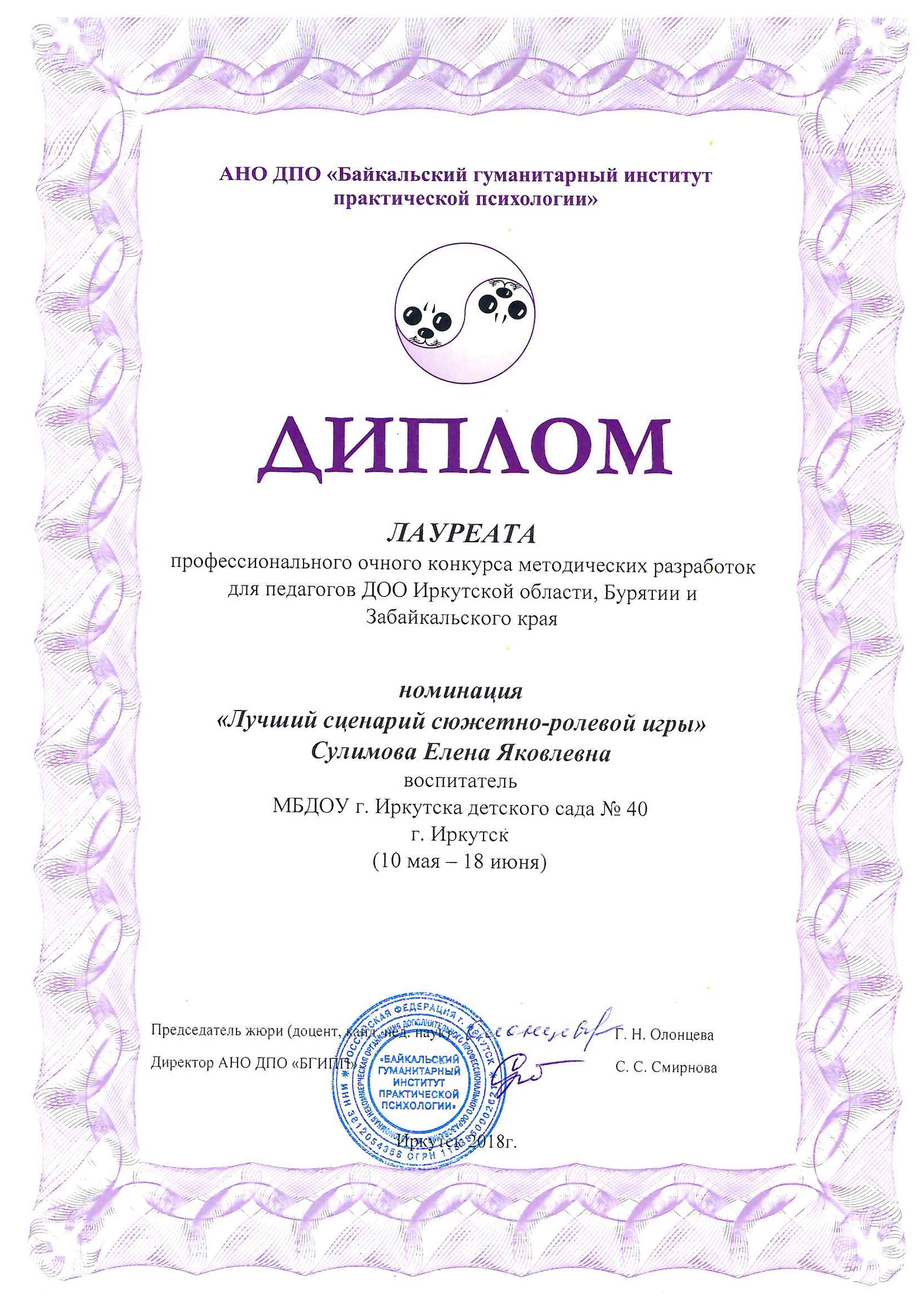 — Профессиональный очный конкурс методических разработок для педагогов ДОО Иркутской области, Бурятии и Забайкальского края. АНО ДПО «Байкальский гуманитарный институт практической психологии» Диплом Лауреата 18 июня 2018 года;
