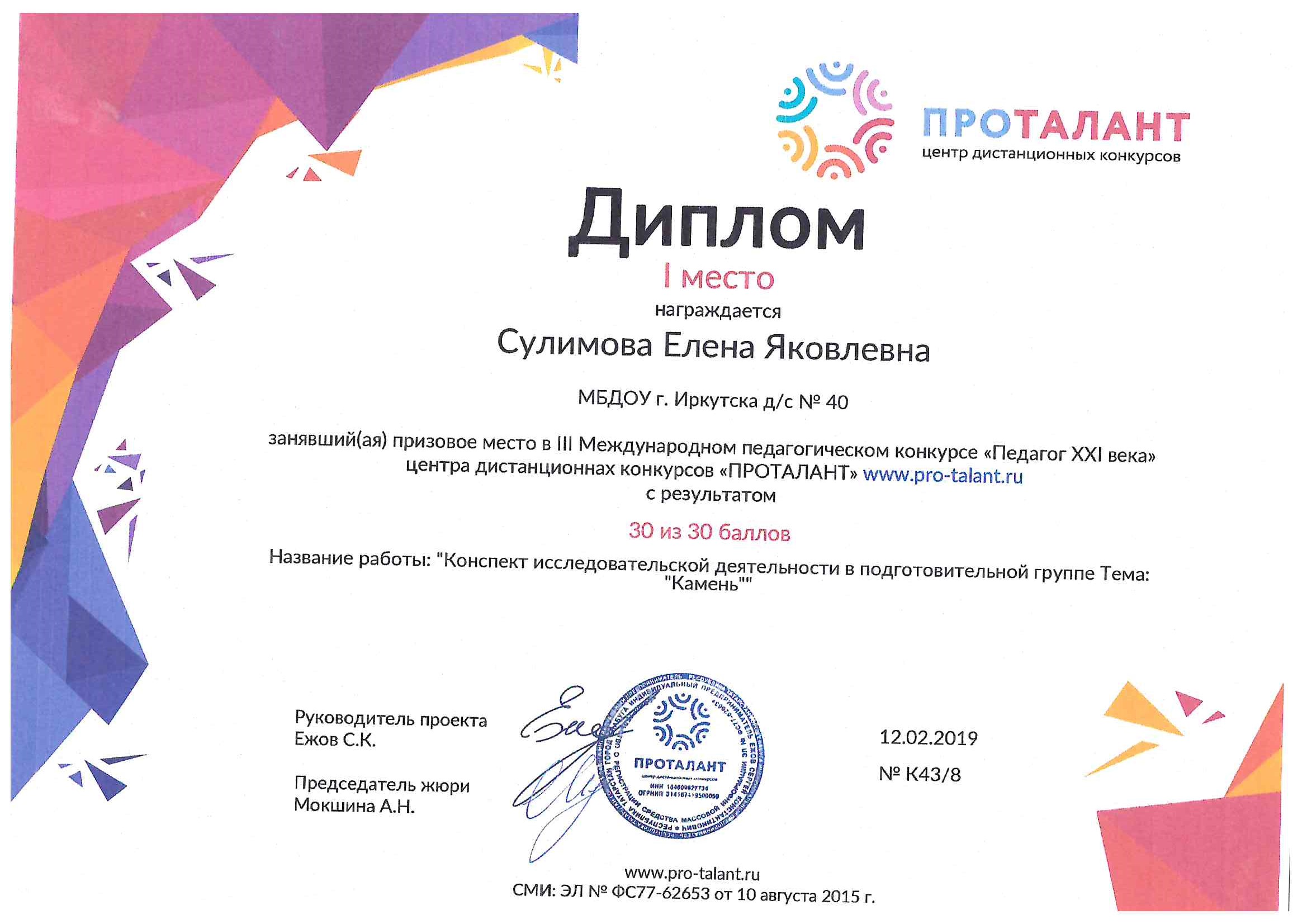 — III Международный педагогический конкурс «Педагог XXI века», Конспект исследовательской деятельности в подготовительной группе «Камень», Диплом I место, 12.02.2019 г.;