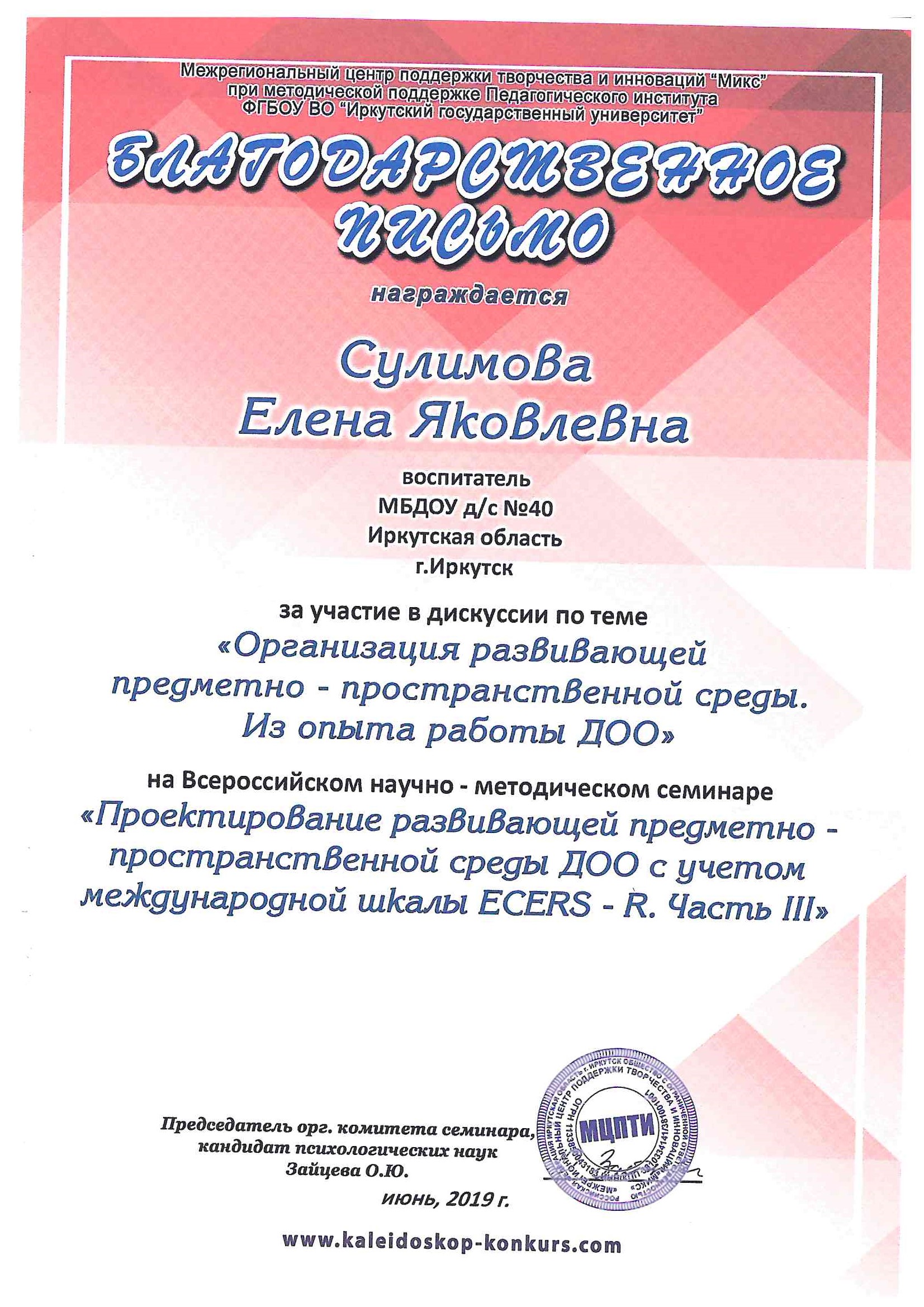 — Благодарственное письмо, РОССИЙСКАЯ ФЕДЕРАЦИЯ город Иркутск ГОРОДСКАЯ ДУМА, воспитателю детского сада Сулимовой Елене Яковлевне за многолетний добросовестный труд в системе дошкольного образования, активную жизненную позицию, за высокие показатели в профессиональной деятельности, 2019 г.