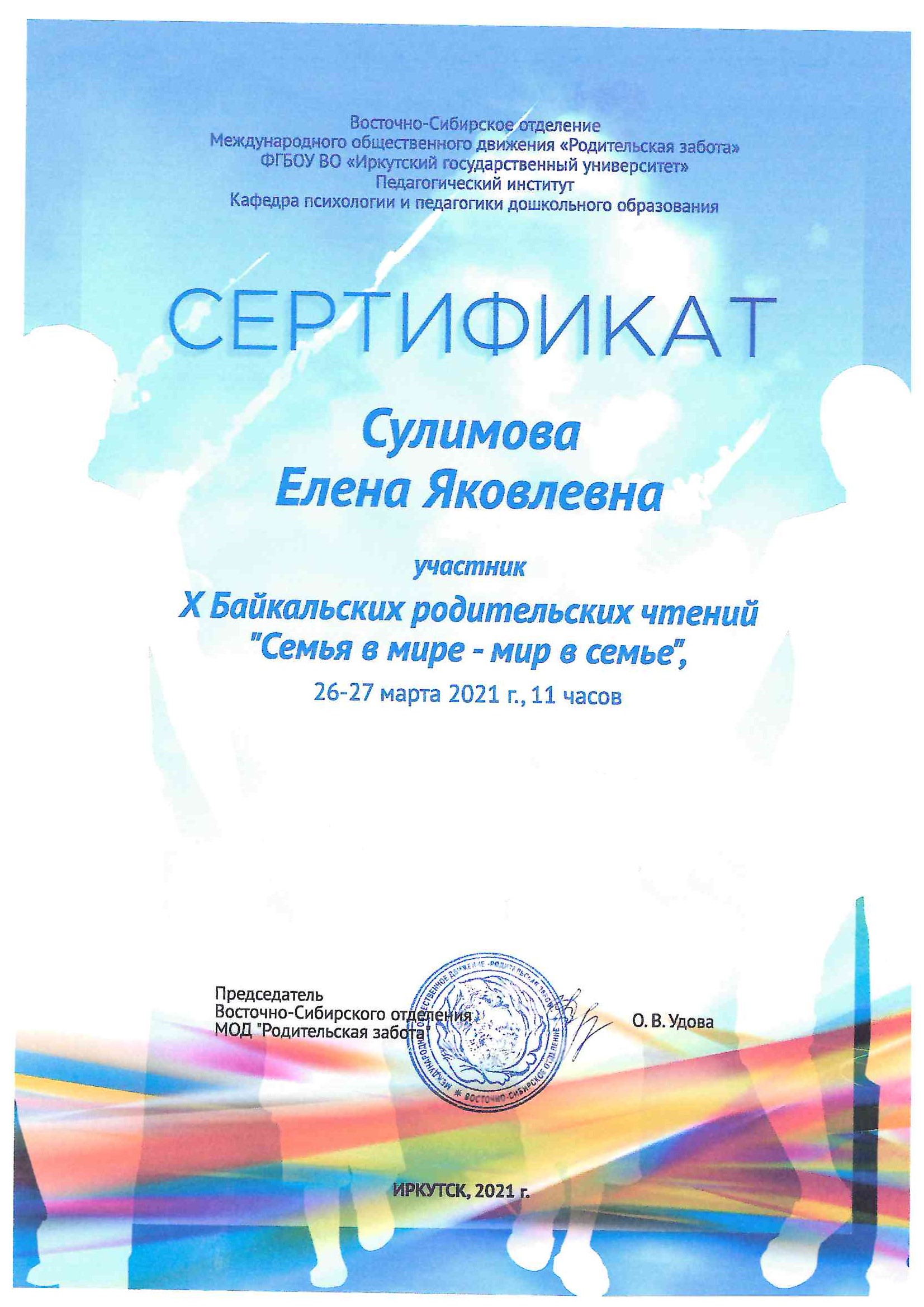 — Сертификат, 26-27 марта, 2021 г. Восточно-Сибирское отделение Международного общественного движения «Родительская забота» ФГБОУ ВО «Иркутский государственный университет» Педагогический институт Кафедра психологии и педагогики дошкольного Образования, участник X Байкальских родительских чтений «Семья в мире-мир в семье», 11 часов;