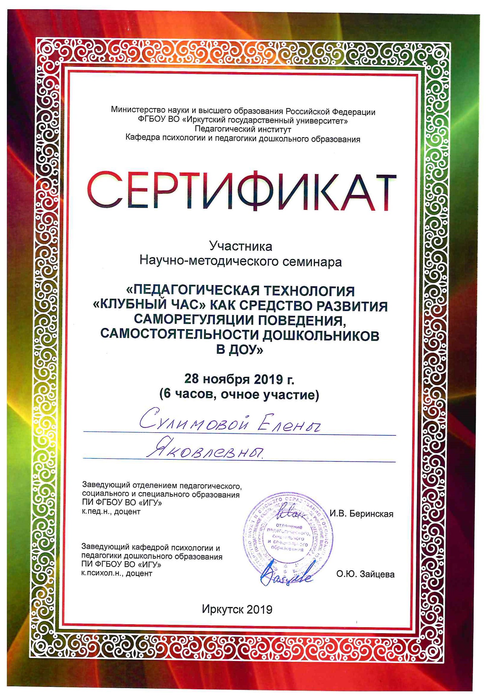 — Сертификат, 29 ноября, 2019 г. Министерство науки и высшего образования Российской Федерации ФГБОУ ВО «Иркутский государственный университет» Педагогический институт Кафедра психологии и педагогики дошкольного образования, Научно-методический семинар «Педагогическая технология «Клубный час» как средство развития саморегуляции поведения, самостоятельности дошкольников в ДОУ», 6 часов, очно;