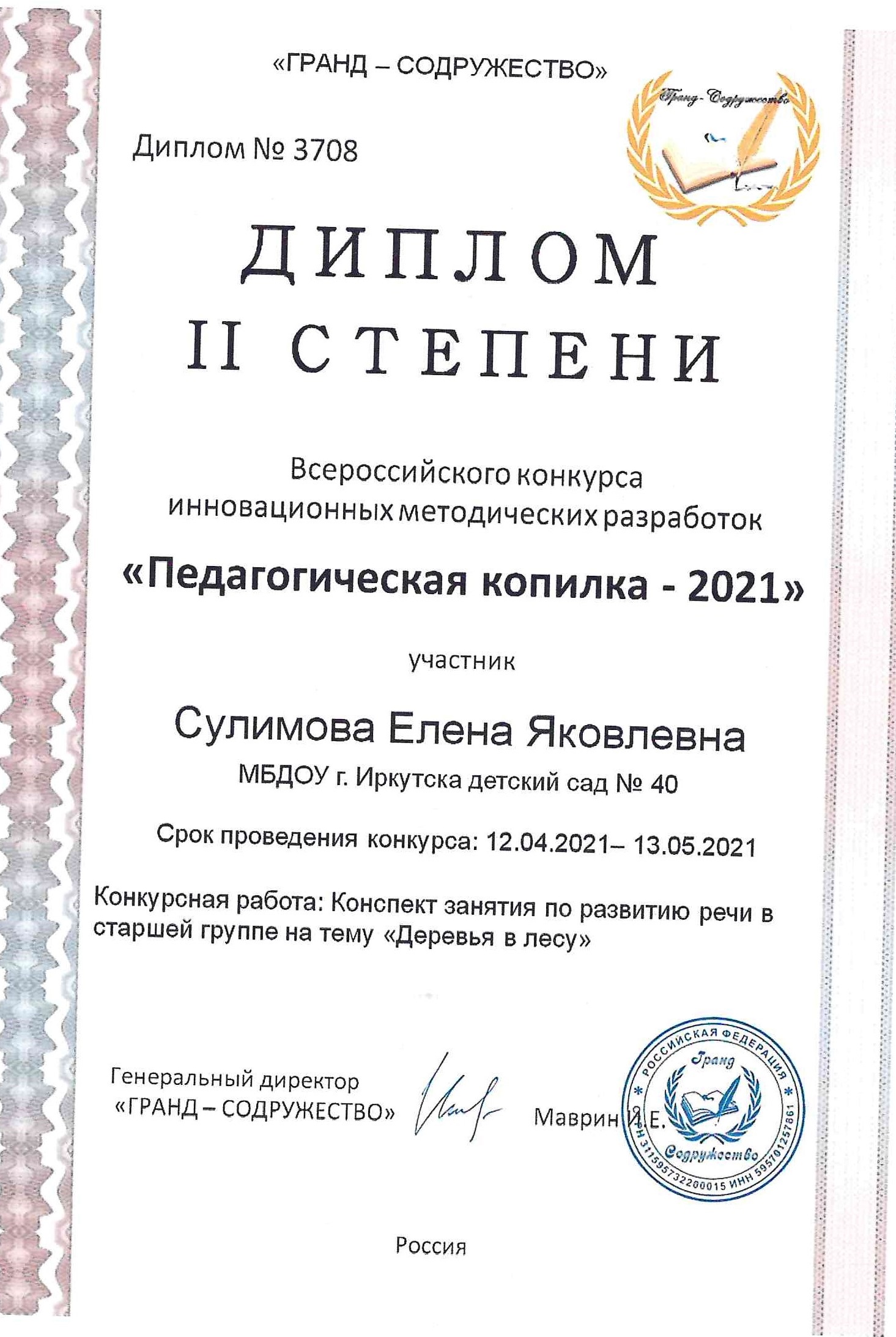 — Всероссийский конкурс инновационных методических разработок «Педагогическая копилка-2021», Конкурсная работа: Конспект занятия по развитию речи в старшей группе на тему «Деревья в лесу», срок проведения 12.04.2021-13.05.2021, Диплом II степени;