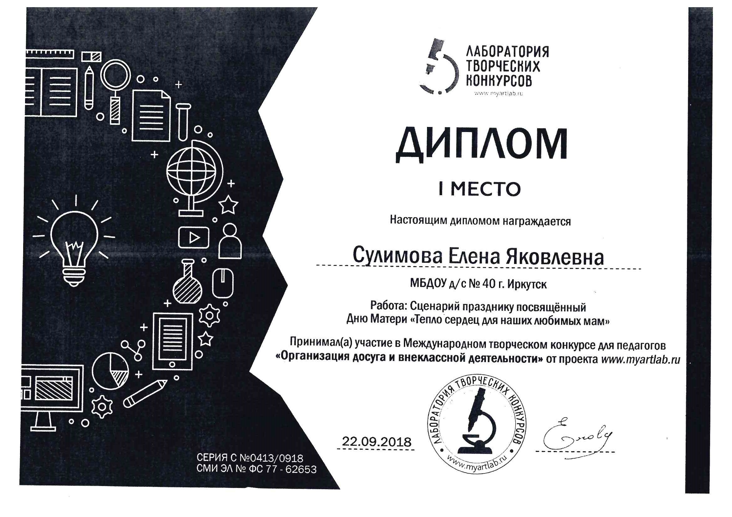 — Международный творческий конкурс для педагогов, Сценарий к празднику посвященный Дню матери «Тепло сердец для наших любимых мам», Диплом I место, 22.09.2018 г.;