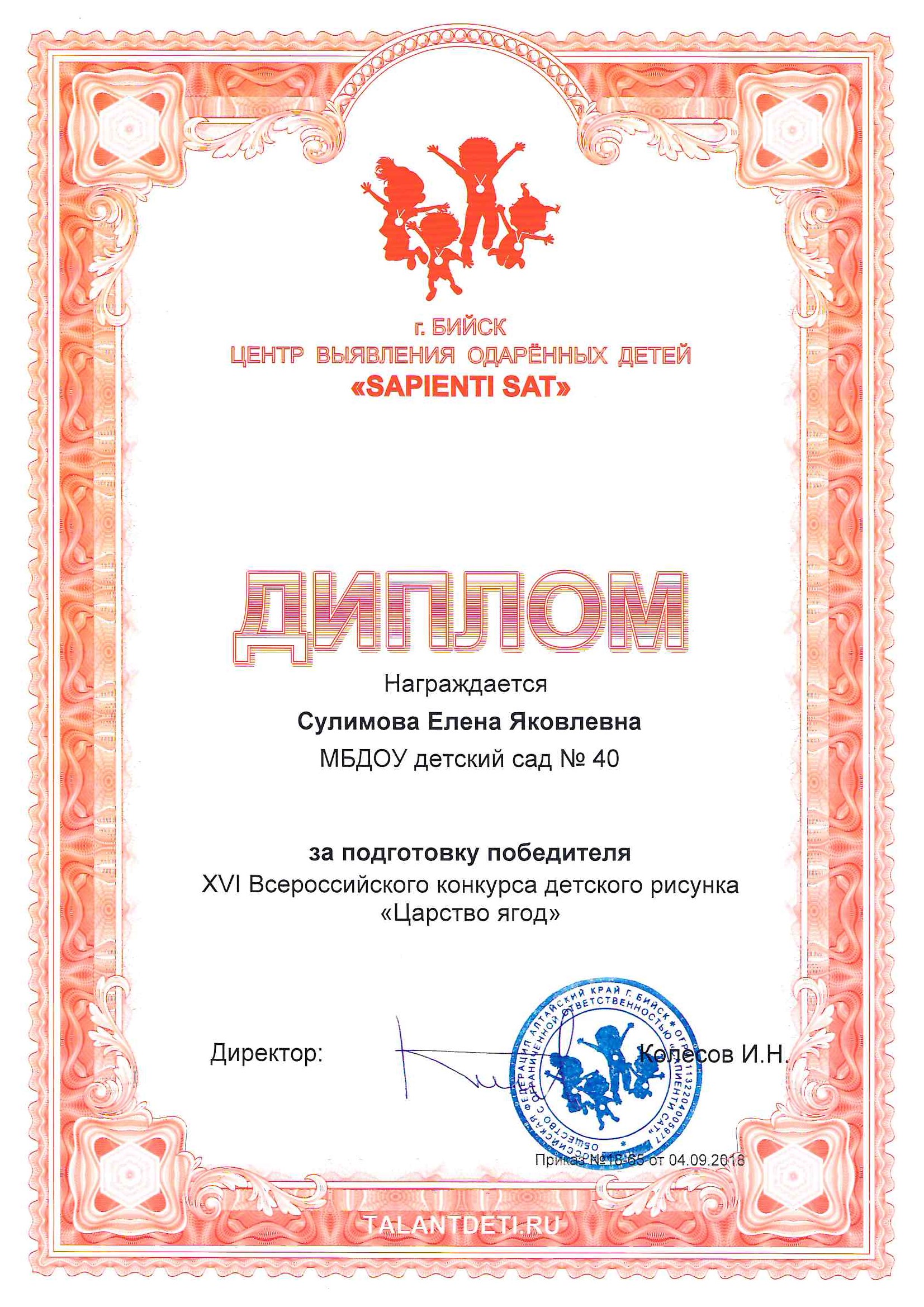 -Диплом, Центр выявления одарённых детей г. Бийск «SAPIENTI SAT», за подготовку победителя XVI Всероссийского конкурса детского рисунка «Царство ягод», 04.09.2018 г.;