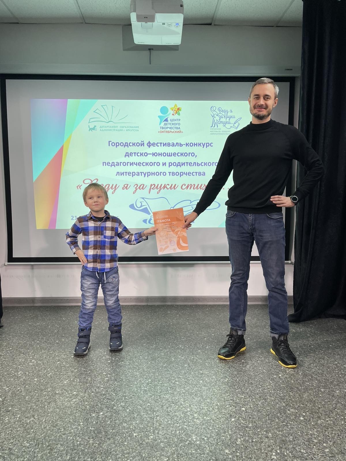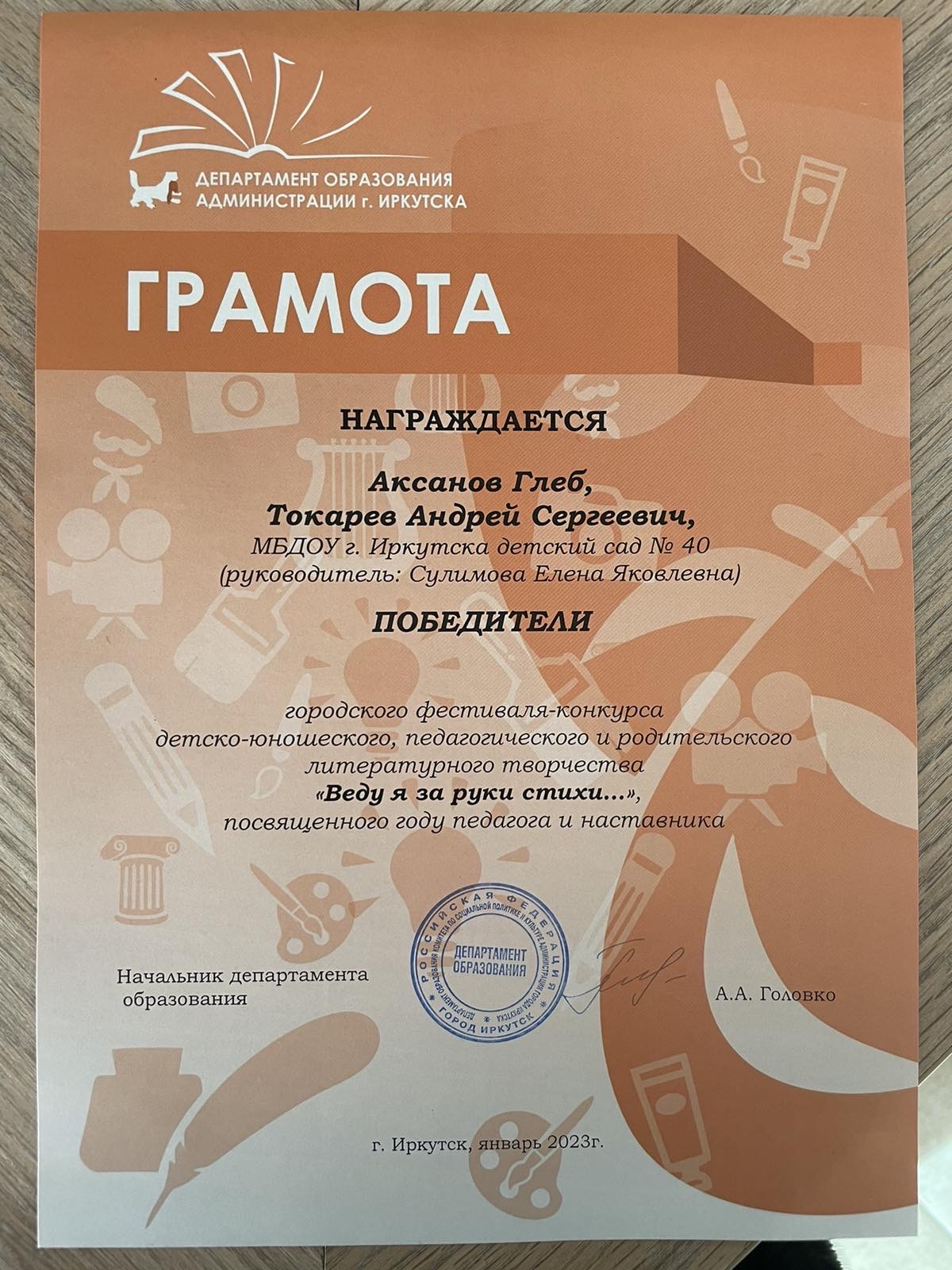 Поздравляем нашего воспитанника подготовительной к школе группы «Лучики» Аксанова Глеба с победой в конкурсе «Веду я за руки стихи…». Благодарим родителей за подготовку ребенка к конкурсу! Желаем дальнейших побед и творческой реализации