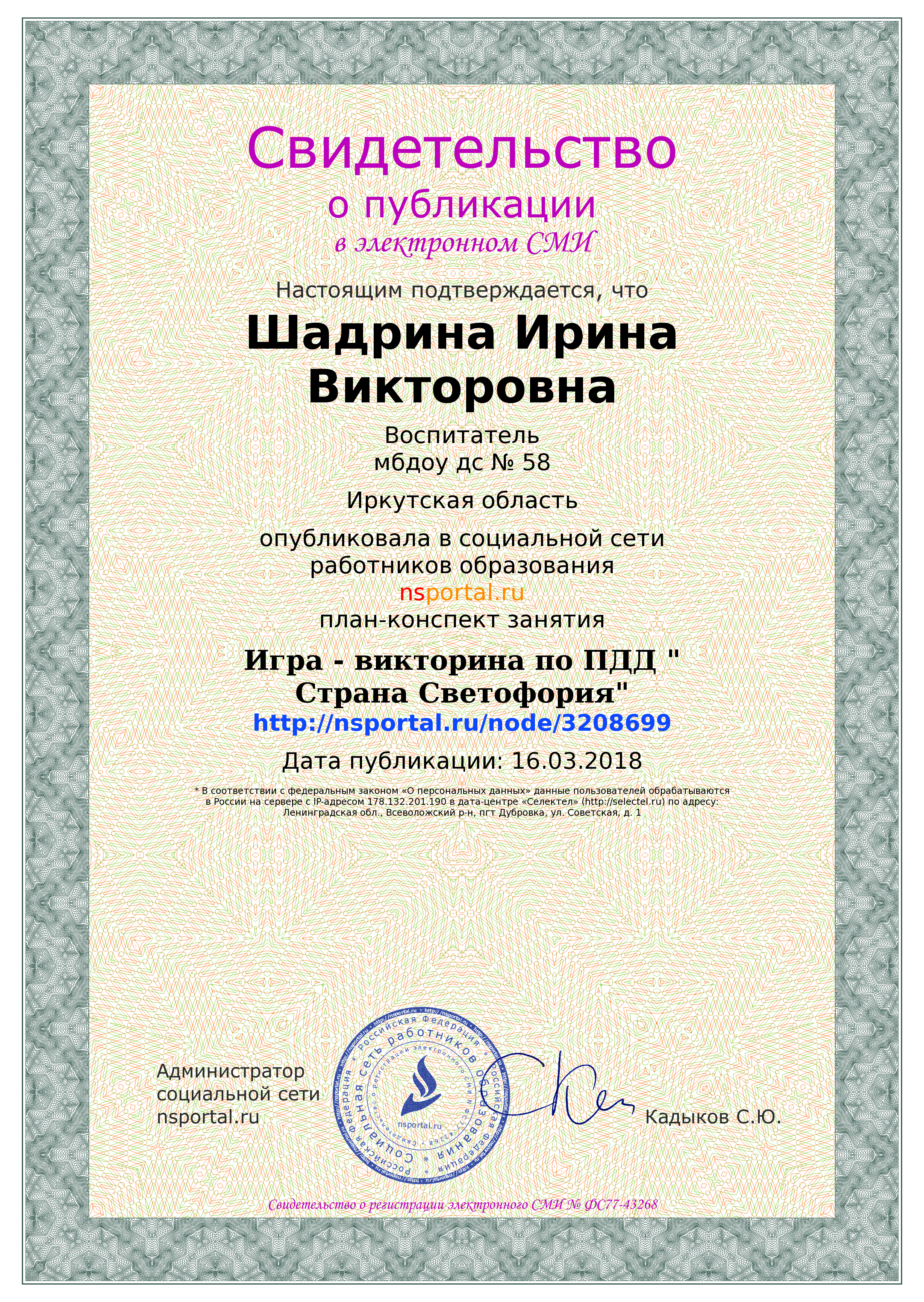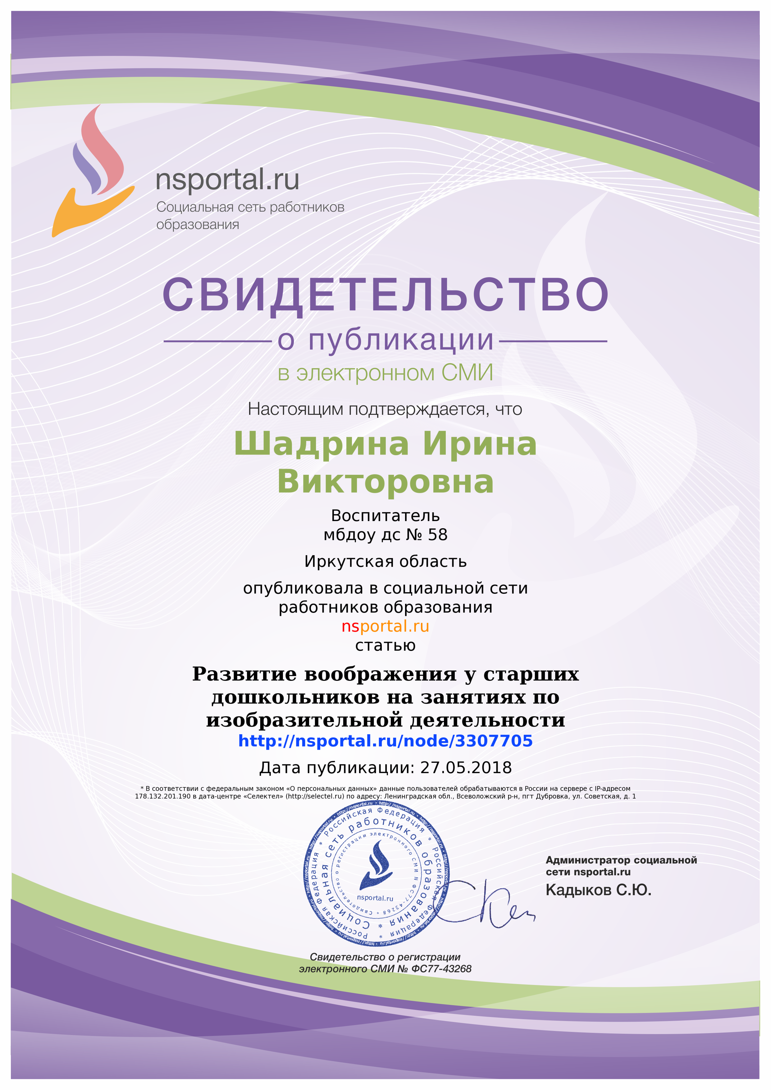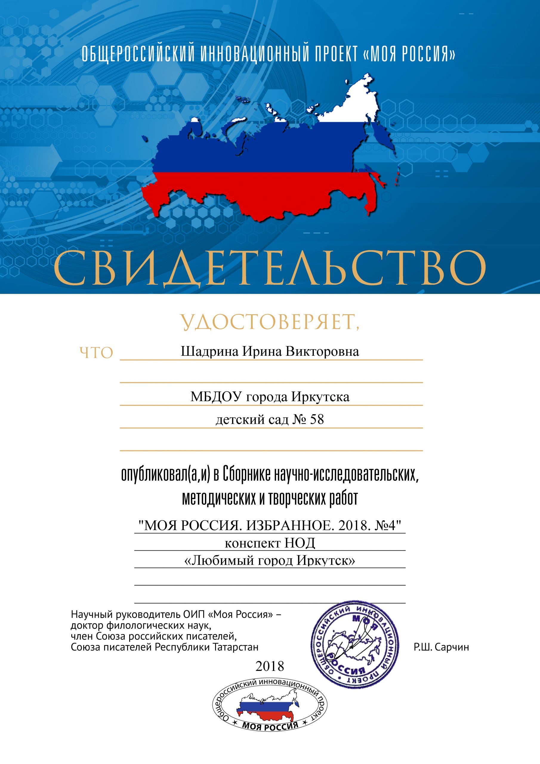 | Удостоверение о повышении квалификации ГАУ ДПО «Институт развития образования Иркутской области» (24.05 2021- 15.06.2021) «Информационная и психологическая безопасность несовершеннолетних в образовательной организации», 72 ч |