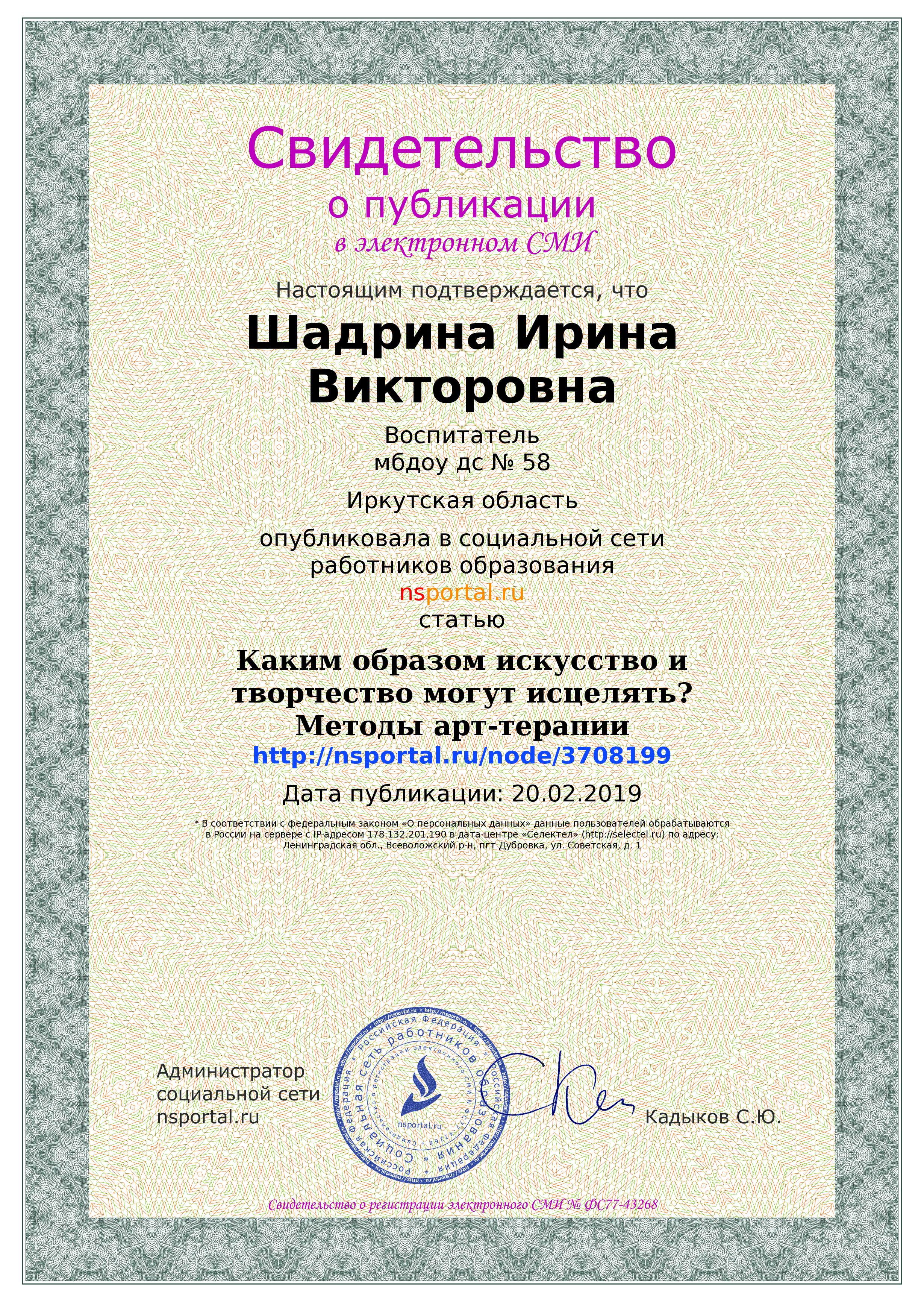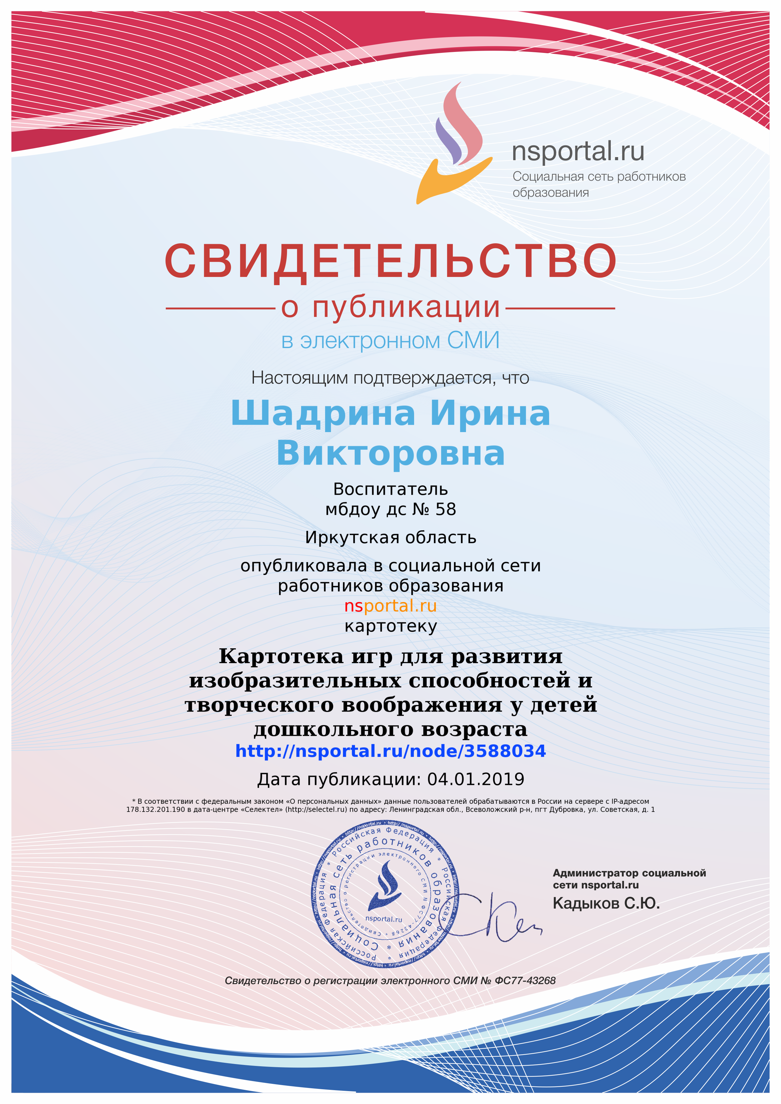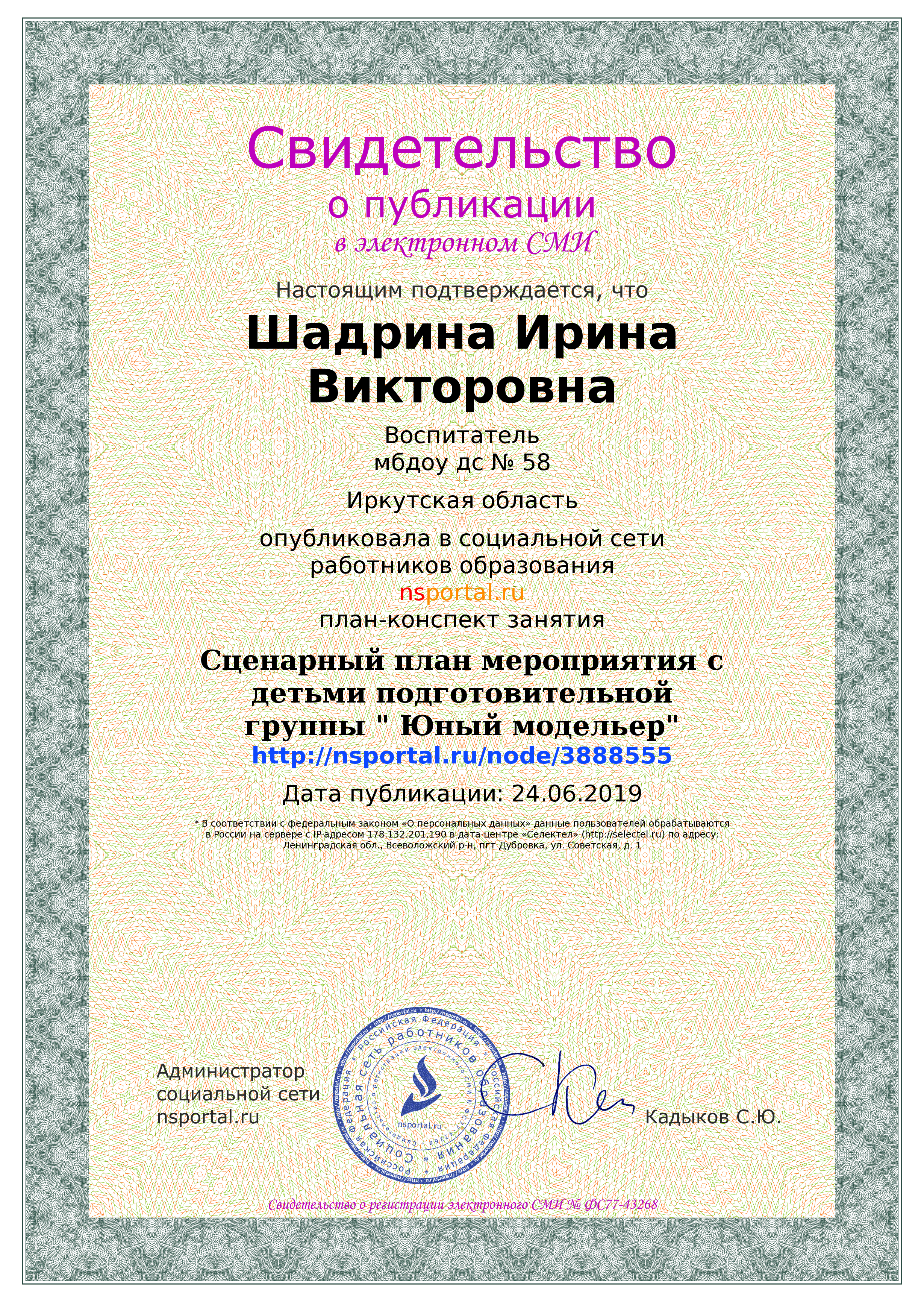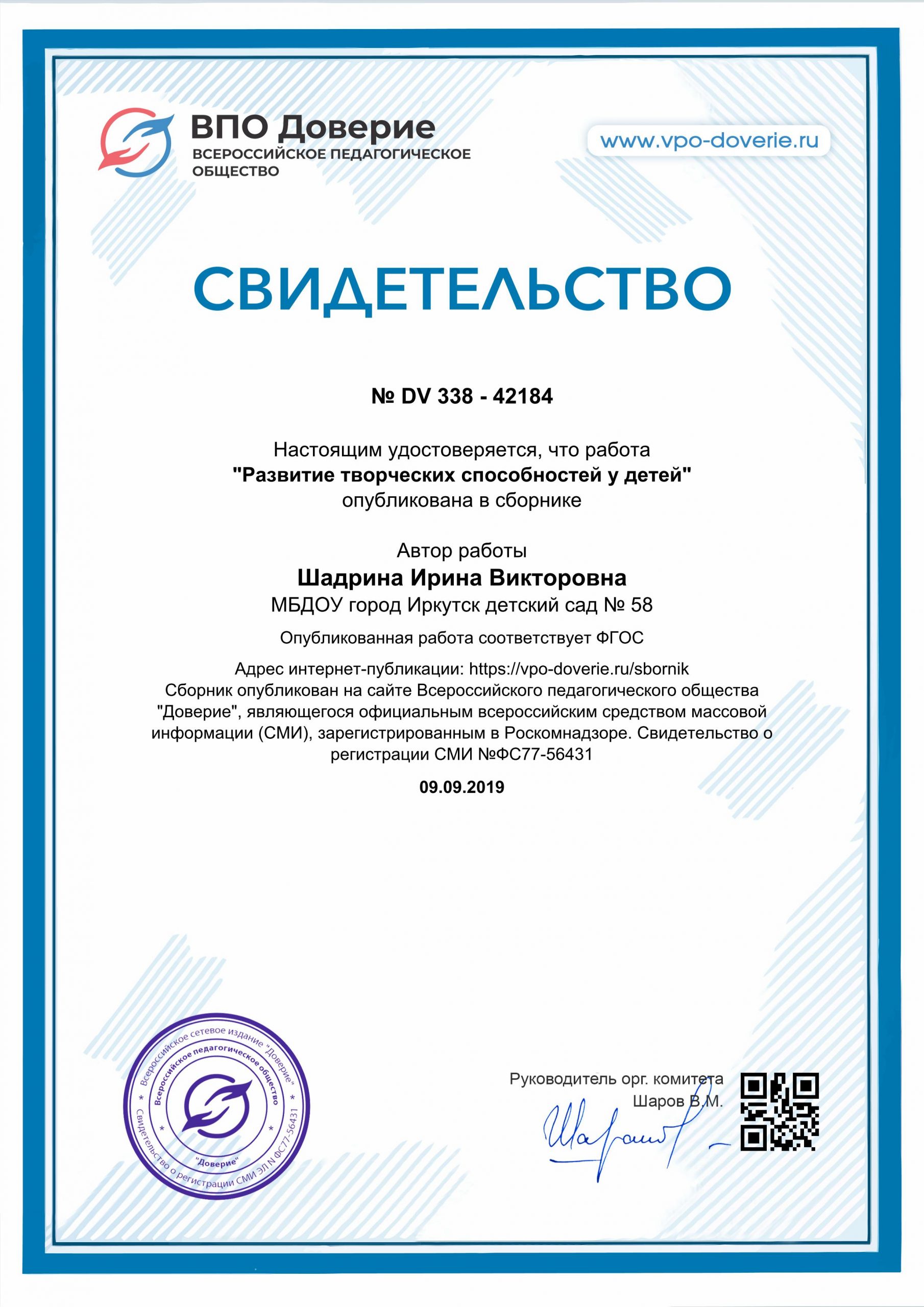 | Удостоверение о повышении квалификации ГАУ ДПО «Институт развития образования Иркутской области» (24.05 2021- 15.06.2021) «Информационная и психологическая безопасность несовершеннолетних в образовательной организации», 72 ч |