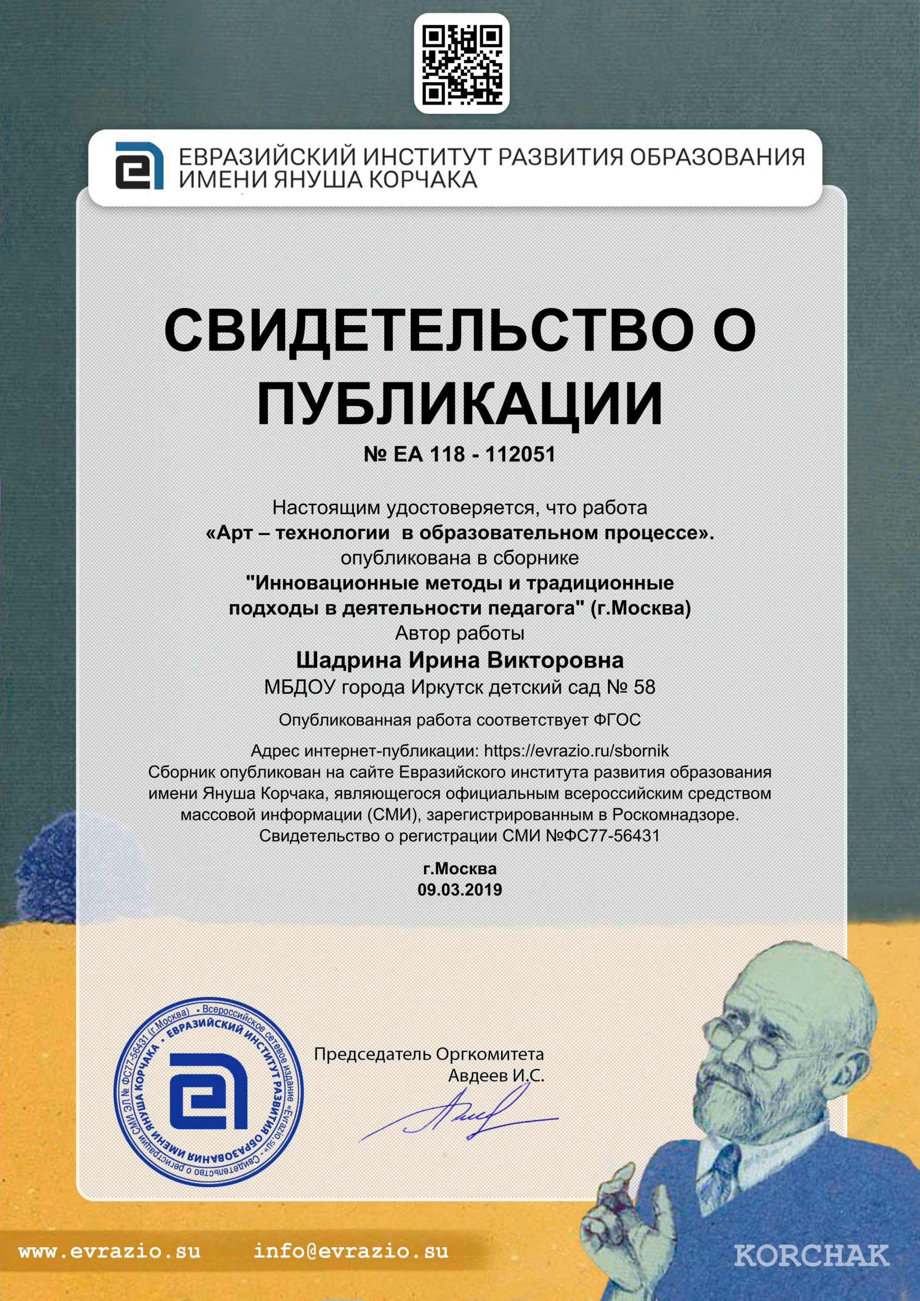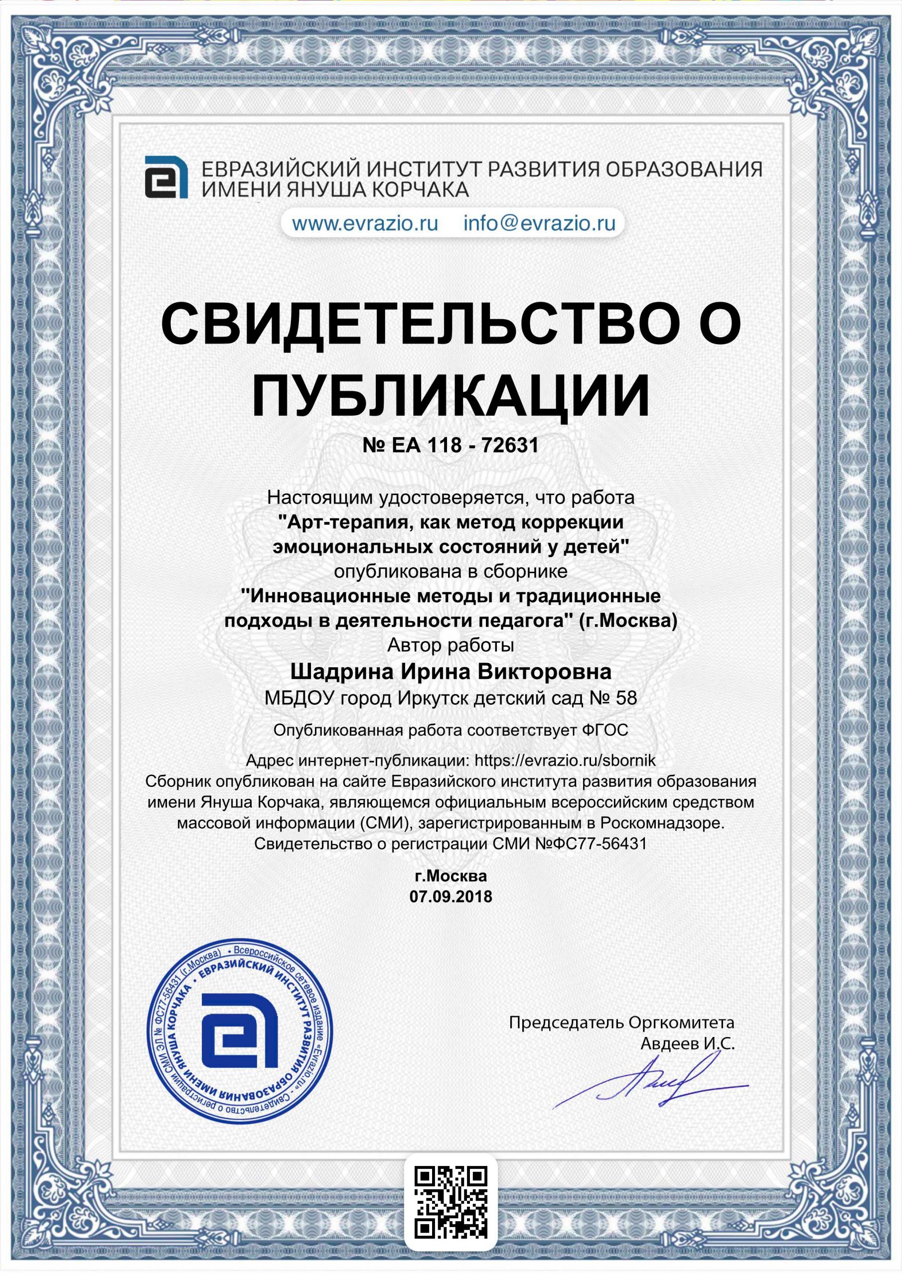 | Удостоверение о повышении квалификации № 6028, 22 мая – 31 мая 2017 г., ГАУ ДПО «Институт развития образования Иркутской области», «Организация коррекционной работы в группах комбинированной и компенсирующей направленности в соответствии», 72 ч.; |